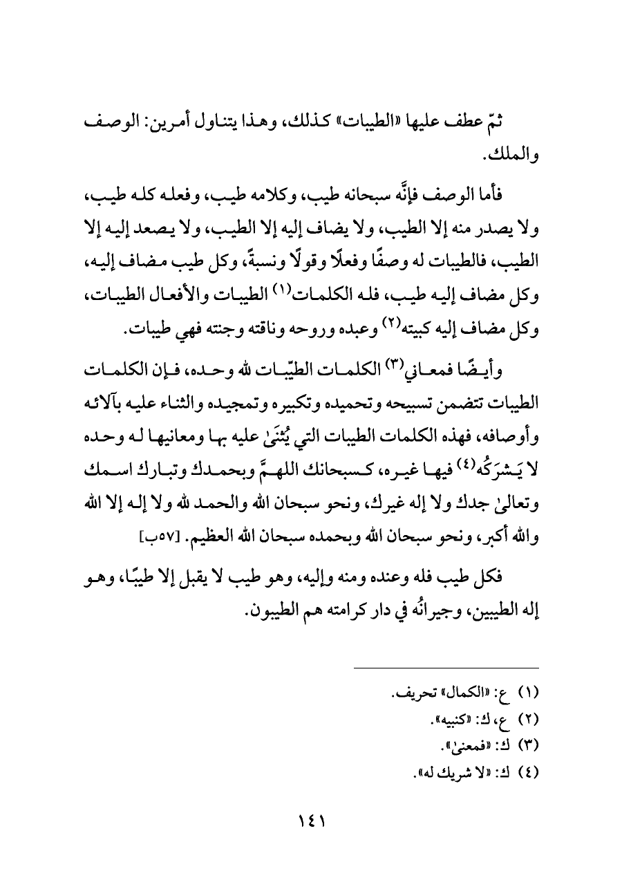 وأيضًا فمعاني (¬٣) الكلمات الطيّبات لله وحده، فإن الكلمات الطيبات تتضمن تسبيحه وتحميده وتكبيره وتمجيده والثناء عليه بآلائه وأوصافه، فهذه الكلمات الطيبات التي يُثنَى عليه بها ومعانيها له وحده لا يَشرَكُه (¬٤) فيها غيره، كسبحانك اللهمَّ وبحمدك وتبارك اسمك وتعالى جدك ولا إله غيرك، ونحو سبحان الله والحمد لله ولا إله إلا الله والله أكبر، ونحو سبحان الله وبحمده سبحان الله العظيم. [٥٧ ب]