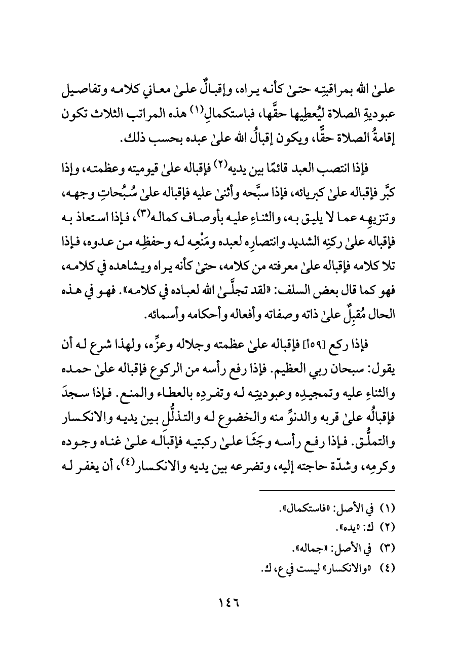 فإذا ركع [٥٩ أ] فإقباله على عظمته وجلاله وعزِّه، ولهذا شرع له أن يقول: سبحان ربي العظيم. فإذا رفع رأسه من الركوع فإقباله على حمده والثناءِ عليه وتمجيدِه وعبوديتِه له وتفردِه بالعطاء والمنع. فإذا سجدَ فإقبالُه على قربه والدنوِّ منه والخضوع له والتذلُّلِ بين يديه والانكسار والتملُّق. فإذا رفع رأسه وجَثَا على ركبتيه فإقباله على غناه وجوده وكرمِه، وشدّة حاجته إليه، وتضرعه بين يديه والانكسار (¬٤)، أن يغفر له
