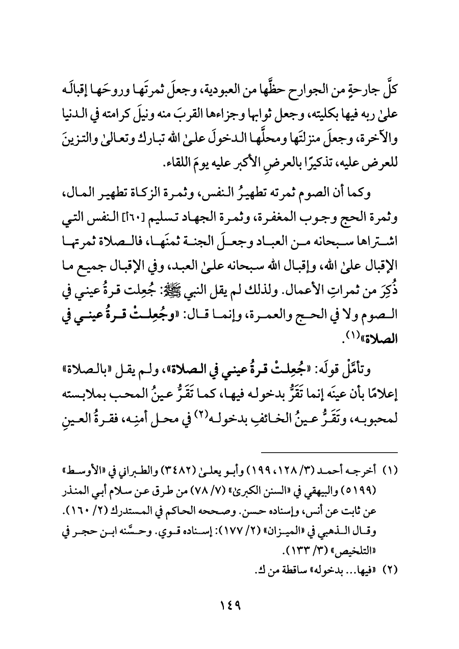 وكما أن الصوم ثمرته تطهيرُ النفس، وثمرة الزكاة تطهير المال، وثمرة الحج وجوب المغفرة، وثمرة الجهاد تسليم [٦٠ أ] النفس التي اشتراها سبحانه من العباد وجعلَ الجنة ثمنَها، فالصلاة ثمرتها الإقبال على الله، وإقبال الله سبحانه على العبد، وفي الإقبال جميع ما ذُكِرَ من ثمراتِ الأعمال. ولذلك لم يقل النبي - صلى الله عليه وسلم -: جُعِلت قرةُ عيني في الصوم ولا في الحج والعمرة، وإنما قال: "وجُعِلتْ قرةُ عيني في الصلاة" (¬١).