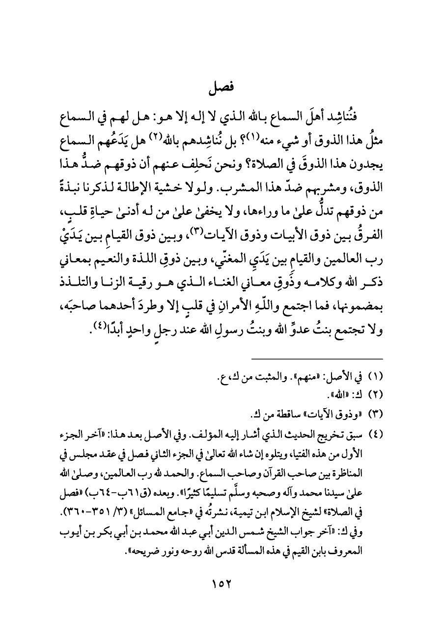 (¬٤) سبق تخريج الحديث الذي أشار إليه المؤلف. وفي الأصل بعد هذا: "آخر الجزء الأول من هذه الفتيا، ويتلوه إن شاء الله تعالى في الجزء الثاني فصل في عقد مجلس في المناظرة بين صاحب القرآن وصاحب السماع. والحمد لله رب العالمين، وصلى الله على سيدنا محمد وآله وصحبه وسلَّم تسليمًا كثيرًا". وبعده (ق ٦١ ب-٦٤ ب) "فصل في الصلاة" لشيخ الإسلام ابن تيمية، نشرتُه في "جامع المسائل" (٣/ ٣٥١ - ٣٦٠). وفي ك: "آخر جواب الشيخ شمس الدين أبي عبد الله محمد بن أبي بكر بن أيوب المعروف بابن القيم في هذه المسألة قدس الله روحه ونور ضريحه".