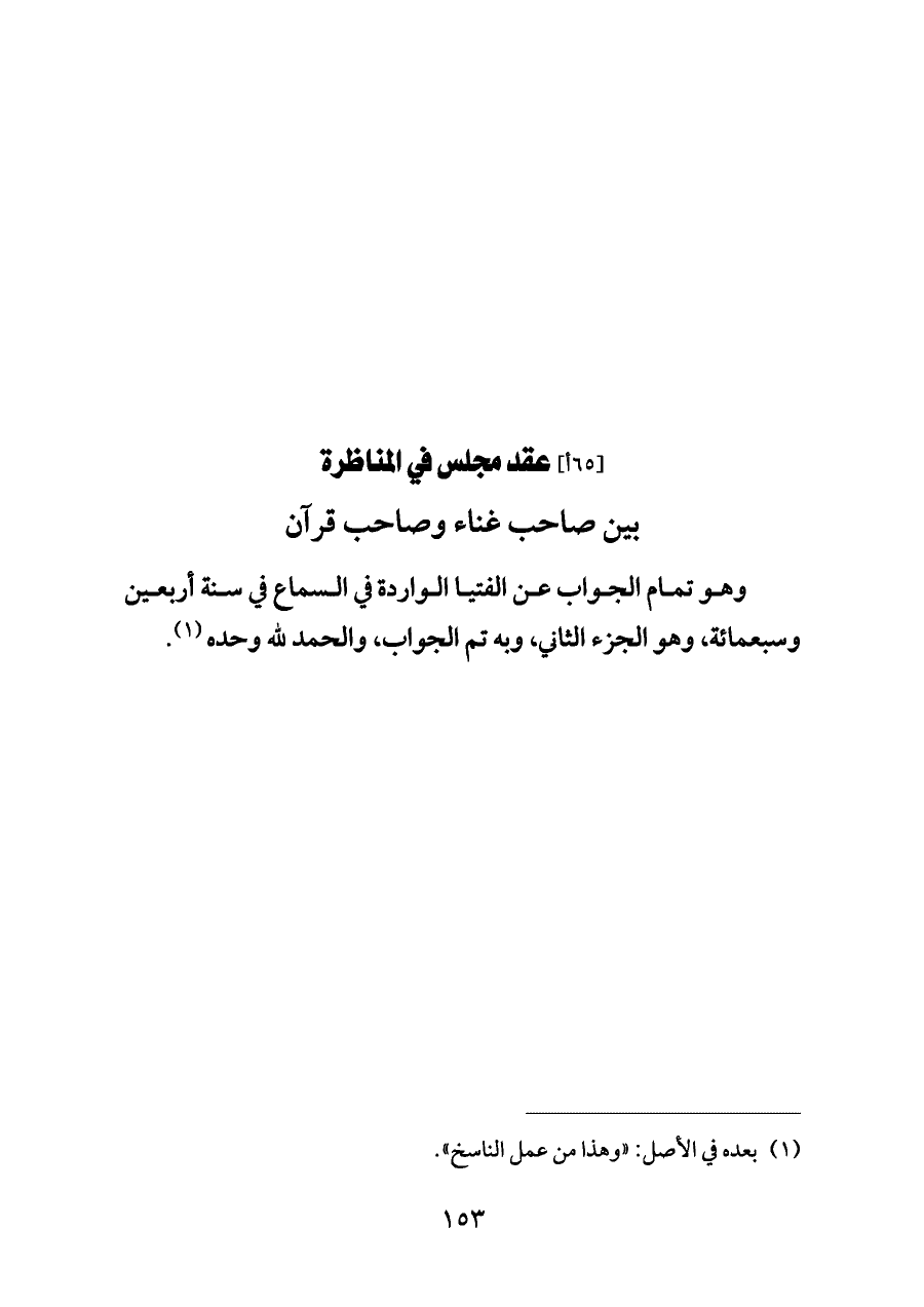 وهو تمام الجواب عن الفتيا الواردة في السماع في سنة أربعين وسبعمائة، وهو الجزء الثاني، وبه تم الجواب، والحمد لله وحده (¬١).
