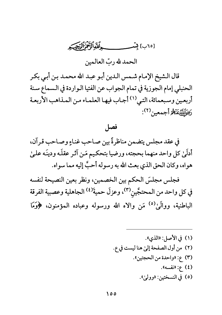 قال الشيخ الإمام شمس الدين أبو عبد الله محمد بن أبي بكر الحنبلي إمام الجوزية في تمام الجواب عن الفتيا الواردة في السماع سنة أربعين وسبعمائة، التي (¬١) أجاب فيها العلماء من المذاهب الأربعة - رضي الله عنهم - أجمعين (¬٢):