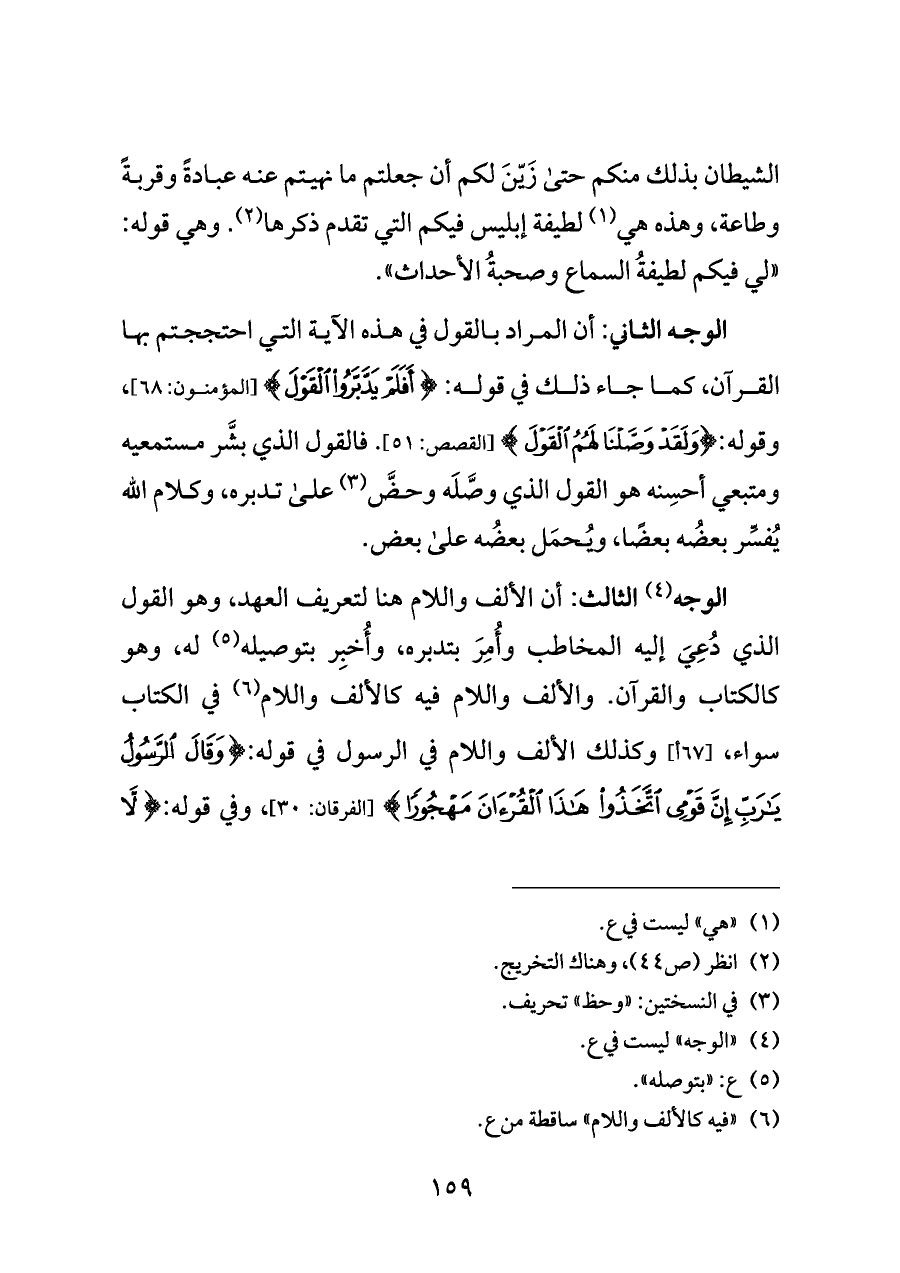 الوجه (¬٤) الثالث: أن الألف واللام هنا لتعريف العهد، وهو القول الذي دُعِيَ إليه المخاطب وأُمِرَ بتدبره، وأُخبِر بتوصيله (¬٥) له، وهو كالكتاب والقرآن. والألف واللام فيه كالألف واللام (¬٦) في الكتاب سواء، [٦٧ أ] وكذلك الألف واللام في الرسول في قوله: {وَقَالَ الرَّسُولُ يَارَبِّ إِنَّ قَوْمِي اتَّخَذُوا هَذَا الْقُرْآنَ مَهْجُورًا} [الفرقان: ٣٠]، وفي قوله: {لَا