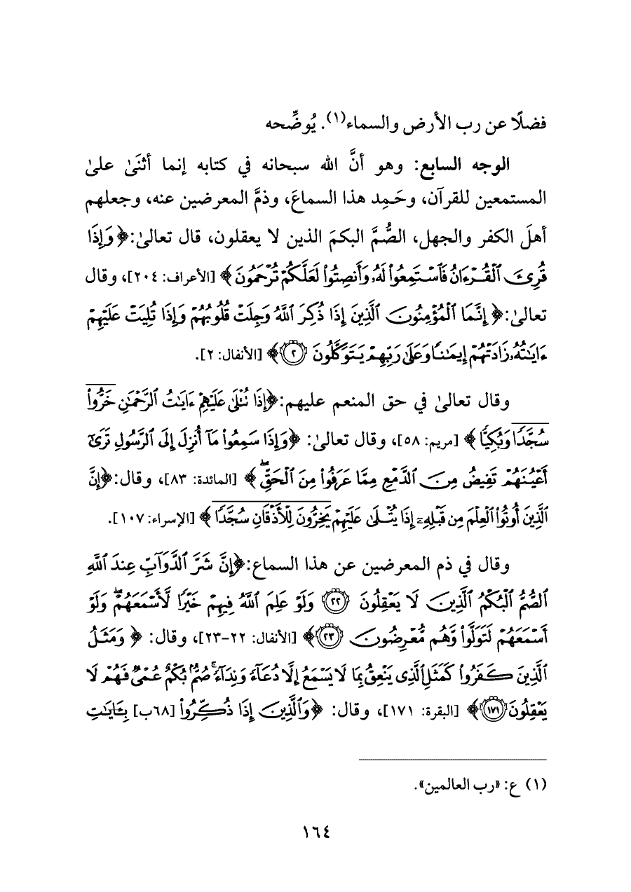 الوجه السابع: وهو أنَّ الله سبحانه في كتابه إنما أثنَى على المستمعين للقرآن، وحَمِد هذا السماعَ، وذمَّ المعرضين عنه، وجعلهم أهلَ الكفر والجهل، الصُّمَّ البكمَ الذين لا يعقلون، قال تعالى: {وَإِذَا قُرِئَ الْقُرْآنُ فَاسْتَمِعُوا لَهُ وَأَنْصِتُوا لَعَلَّكُمْ تُرْحَمُونَ} [الأعراف: ٢٠٤]، وقال تعالى: {إِنَّمَا الْمُؤْمِنُونَ الَّذِينَ إِذَا ذُكِرَ اللَّهُ وَجِلَتْ قُلُوبُهُمْ وَإِذَا تُلِيَتْ عَلَيْهِمْ آيَاتُهُ زَادَتْهُمْ إِيمَانًا وَعَلَى رَبِّهِمْ يَتَوَكَّلُونَ (٢)} [الأنفال: ٢].