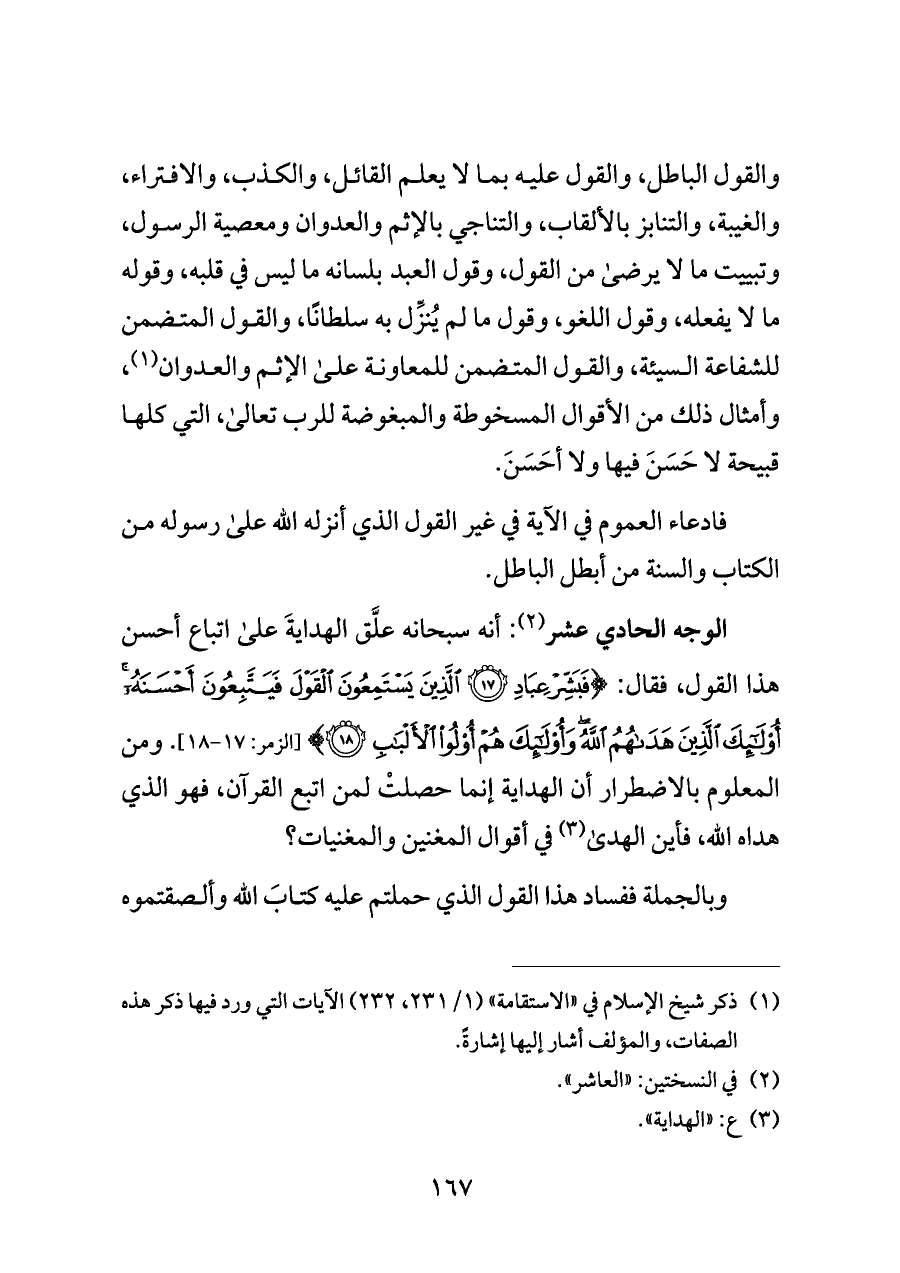 الوجه الحادي عشر (¬٢): أنه سبحانه علَّق الهدايةَ على اتباع أحسن هذا القول، فقال: {فَبَشِّرْ عِبَادِ (١٧) الَّذِينَ يَسْتَمِعُونَ الْقَوْلَ فَيَتَّبِعُونَ أَحْسَنَهُ أُولَئِكَ الَّذِينَ هَدَاهُمُ اللَّهُ وَأُولَئِكَ هُمْ أُولُو الْأَلْبَابِ (١٨)} [الزمر: ١٧ - ١٨]. ومن المعلوم بالاضطرار أن الهداية إنما حصلتْ لمن اتبع القرآن، فهو الذي هداه الله، فأين الهدى (¬٣) في أقوال المغنين والمغنيات؟