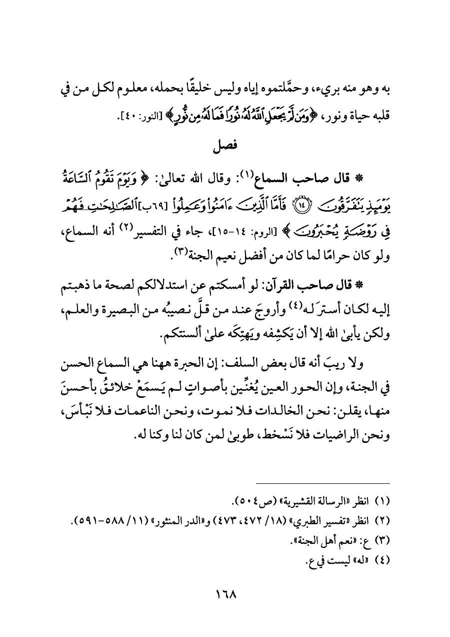 * قال صاحب السماع (¬١): وقال الله تعالى: {وَيَوْمَ تَقُومُ السَّاعَةُ يَوْمَئِذٍ يَتَفَرَّقُونَ (١٤) فَأَمَّا الَّذِينَ آمَنُوا وَعَمِلُوا [٦٩ ب] الصَّالِحَاتِ فَهُمْ فِي رَوْضَةٍ يُحْبَرُونَ} [الروم: ١٤ - ١٥]، جاء في التفسير (¬٢) أنه السماع، ولو كان حرامًا لما كان من أفضل نعيم الجنة (¬٣).