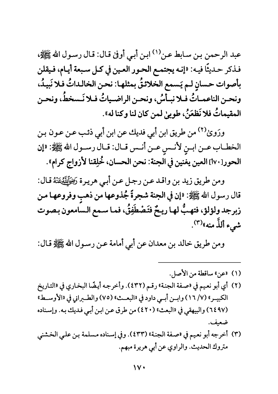 (¬٢) أي أبو نعيم في "صفة الجنة" رقم (٤٣٢). وأخرجه أيضًا البخاري في "التاريخ الكبير" (٧/ ١٦) وابن أبي داود في "البعث" (٧٥) والطبراني في "الأوسط" (٦٤٩٧) والبيهقي في "البعث" (٤٢٠) من طرق عن ابن أبي فديك به. وإسناده ضعيف.