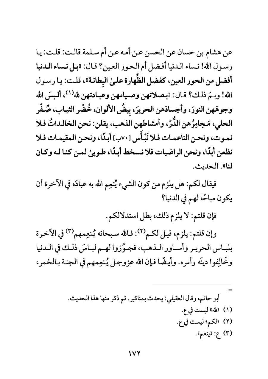عن هشام بن حسان عن الحسن عن أمه عن أم سلمة قالت: قلت: يا رسول الله! نساء الدنيا أفضل أم الحور العين؟ قال: "بل نساء الدنيا أفضل من الحور العين، كفضل الظِّهارة على البِطانة"، قلت: يا رسول الله! وبمَ ذلك؟ قال: "بصلاتهن وصيامهن وعبادتهن لله (¬١)، ألبسَ الله وجوهَهن النورَ، وأجسادَهن الحريرَ، بِيضُ الألوان، خُضْر الثياب، صُفْر الحلي، مَجامِرُهن الدُّرّ، وأمشاطهن الذهب، يقلن: نحن الخالداتُ فلا نموت، ونحن الناعمات فلا نَبْأَس [٧٠ ب] أبدًا، ونحن المقيمات فلا نظعن أبدًا، ونحن الراضيات فلا نسخط أبدًا، طوبى لمن كنا له وكان لنا". الحديث.
