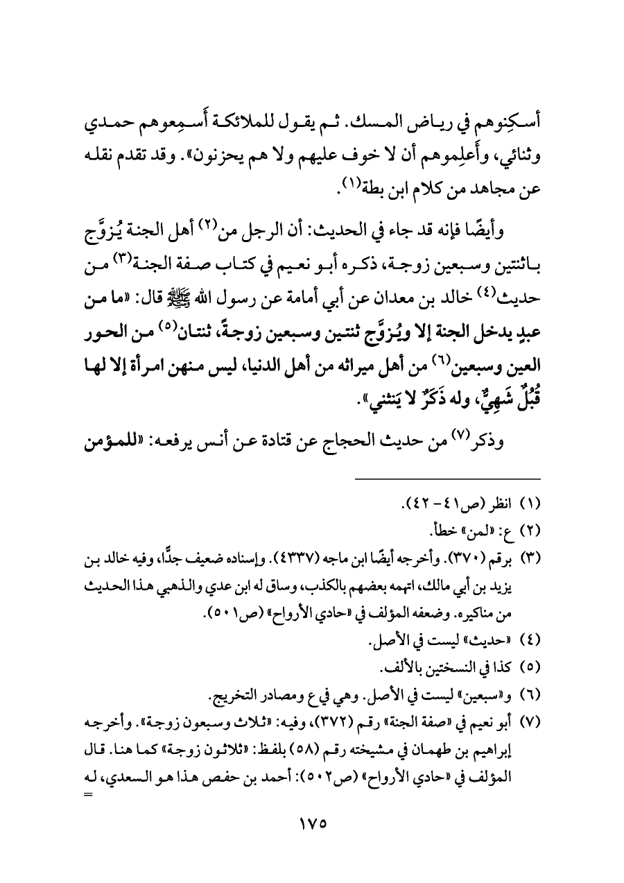 (¬٧) أبو نعيم في "صفة الجنة" رقم (٣٧٢)، وفيه: "ثلاث وسبعون زوجة". وأخرجه إبراهيم بن طهمان في مشيخته رقم (٥٨) بلفظ: "ثلاثون زوجة" كما هنا. قال المؤلف في "حادي الأرواح" (ص ٥٠٢): أحمد بن حفص هذا هو السعدي، له مناكير. والحجاج هو ابن أرطاة.