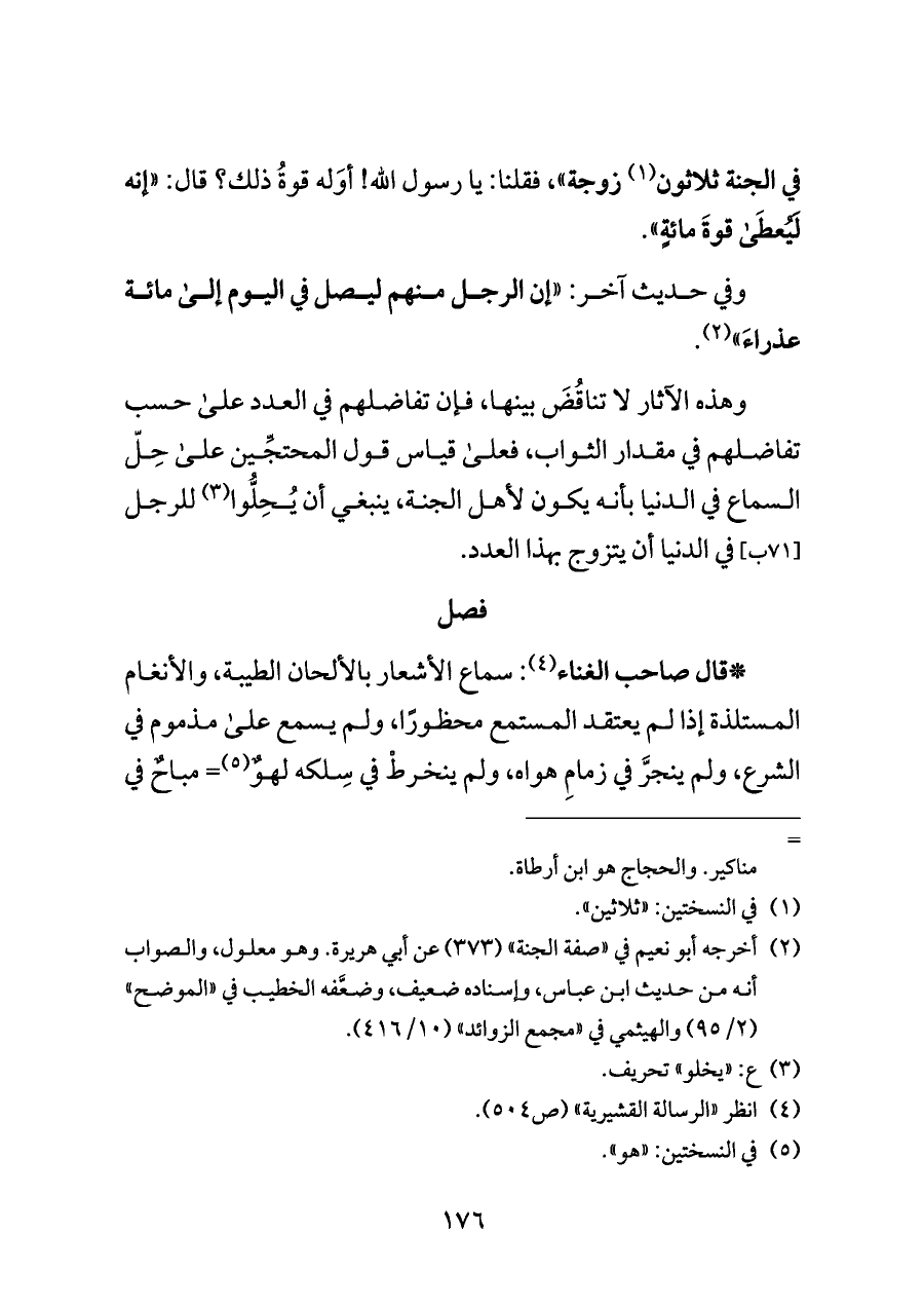وهذه الآثار لا تناقُضَ بينها، فإن تفاضلهم في العدد على حسب تفاضلهم في مقدار الثواب، فعلى قياس قول المحتجِّين على حِلّ السماع في الدنيا بأنه يكون لأهل الجنة، ينبغي أن يُحِلُّوا (¬٣) للرجل [٧١ ب] في الدنيا أن يتزوج بهذا العدد.