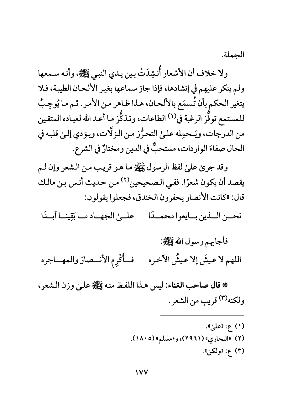 وقد جرى على لفظ الرسول - صلى الله عليه وسلم - ما هو قريب من الشعر وإن لم يقصد أن يكون شعرًا. ففي الصحيحين (¬٢) من حديث أنس بن مالك قال: "كانت الأنصار يحفرون الخندق، فجعلوا يقولون: