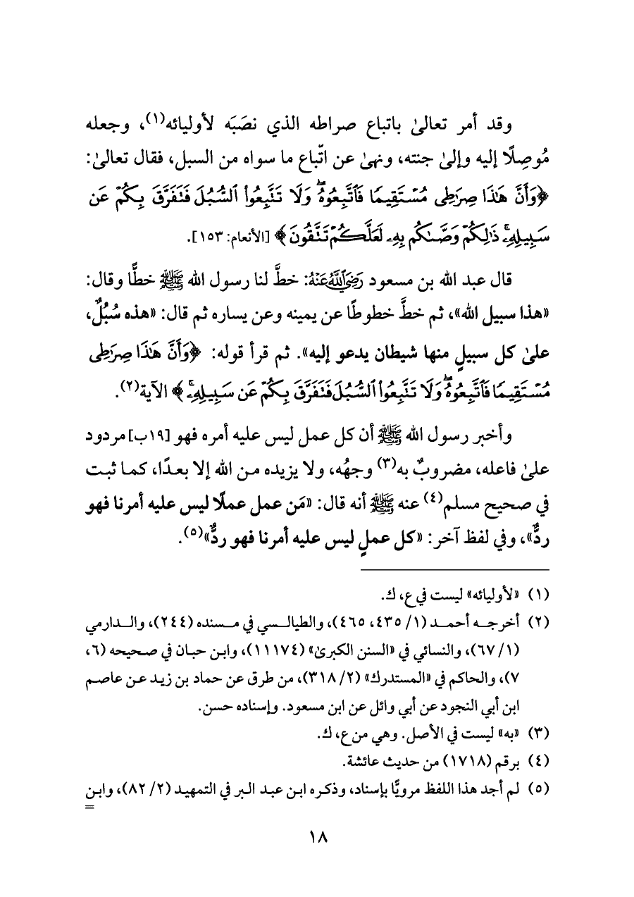قال عبد الله بن مسعود - رضي الله عنه -: خطَّ لنا رسول الله - صلى الله عليه وسلم - خطًّا وقال: "هذا سبيل الله"، ثم خطَّ خطوطًا عن يمينه وعن يساره ثم قال: "هذه سُبُلٌ، على كل سبيلٍ منها شيطان يدعو إليه". ثم قرأ قوله: {وَأَنَّ هَذَا صِرَاطِي مُسْتَقِيمًا فَاتَّبِعُوهُ وَلَا تَتَّبِعُوا السُّبُلَ فَتَفَرَّقَ بِكُمْ عَنْ سَبِيلِهِ} الآية (¬٢).