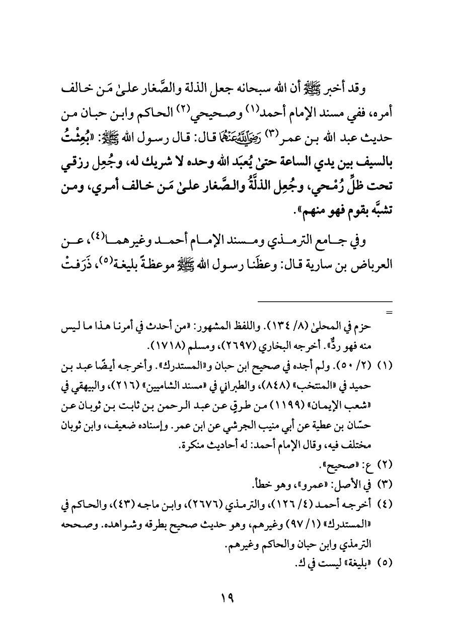 وقد أخبر - صلى الله عليه وسلم - أن الله سبحانه جعل الذلة والصَّغار على مَن خالف أمره، ففي مسند الإمام أحمد (¬١) وصحيحي (¬٢) الحاكم وابن حبان من حديث عبد الله بن عمر (¬٣) قال: قال رسول الله - صلى الله عليه وسلم -: "بُعِثْتُ بالسيف بين يدي الساعة حتى يُعبَد الله وحده لا شريك له، وجُعِل رزقي تحت ظلِّ رُمْحي، وجُعِل الذلَّةُ والصَّغار على مَن خالف أمري، ومن تشبَّه بقوم فهو منهم".