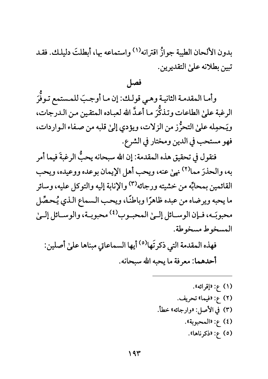وأما المقدمة الثانية وهي قولك: إن ما أوجبَ للمستمع توفُّرَ الرغبة على الطاعات وتذكُّرَ ما أعدَّ الله لعباده المتقين من الدرجات، ويَحمِله على التحرُّز من الزلات، ويؤدي إلى قلبه من صفاء الواردات، فهو مستحب في الدين ومختار في الشرع.