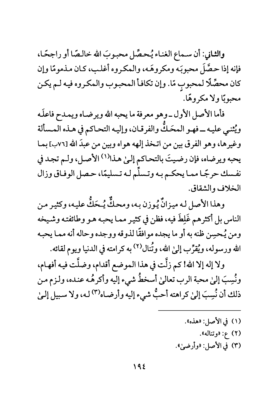فأما الأصل الأول ــ وهو معرفة ما يحبه الله ويرضاه ويمدح فاعلَه ويُثني عليه ــ فهو المحَكُّ والفرقان، وإليه التحاكم في هذه المسألة وغيرها، وهو الفرق بين من اتخذ إلهه هواه وبين من عبدَ الله [٧٦ ب] بما يحبه ويرضاه، فإن رضيتَ بالتحاكم إلى هذا (¬١) الأصل، ولم تجد في نفسك حرجًا مما يحكم به وتسلِّم له تسليمًا، حصل الوفاق وزال الخلاف والشقاق.