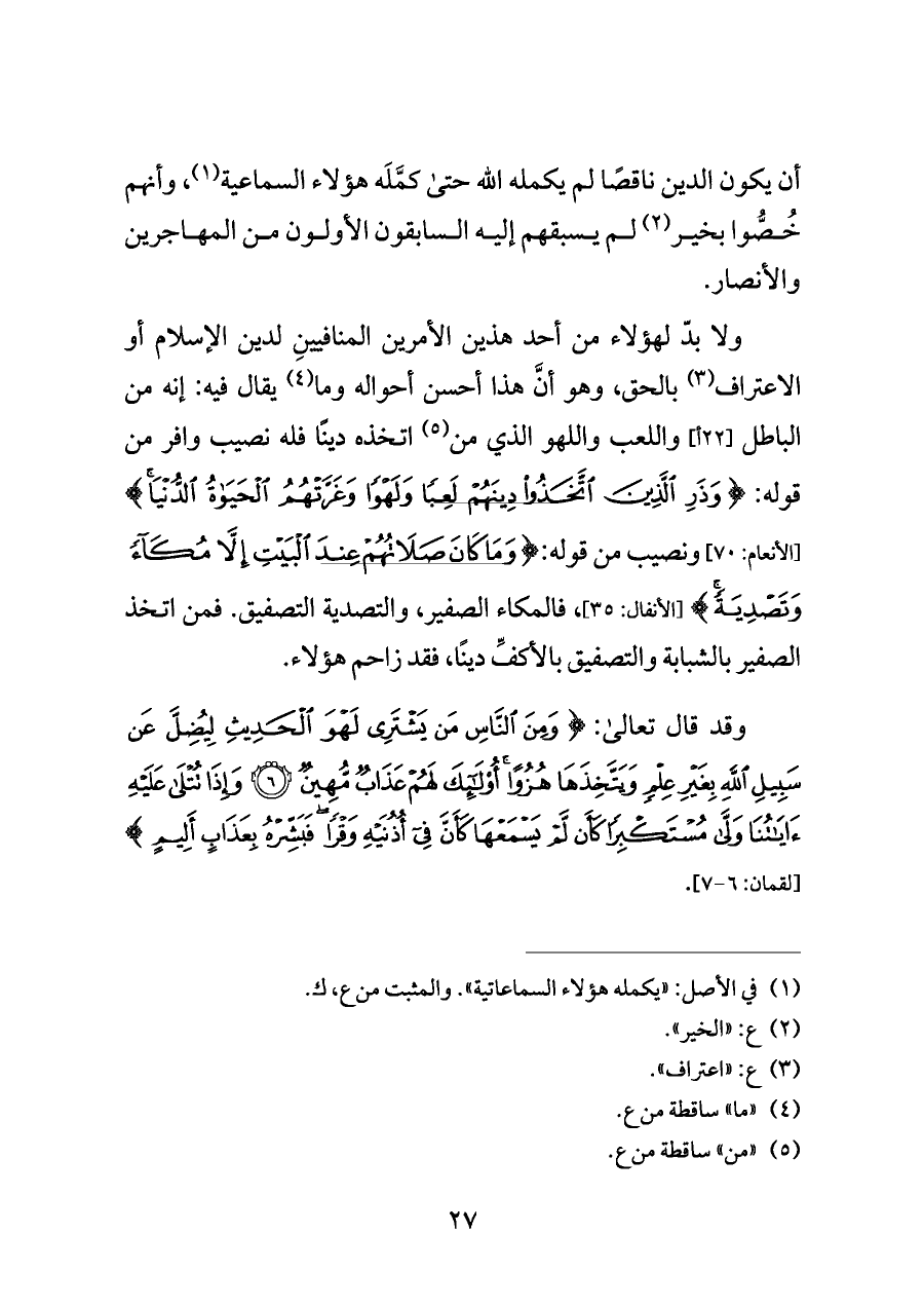 ولا بدّ لهؤلاء من أحد هذين الأمرين المنافيينِ لدين الإسلام أو الاعتراف (¬٣) بالحق، وهو أنَّ هذا أحسن أحواله وما (¬٤) يقال فيه: إنه من الباطل [٢٢ أ] واللعب واللهو الذي من (¬٥) اتخذه دينًا فله نصيب وافر من قوله: {وَذَرِ الَّذِينَ اتَّخَذُوا دِينَهُمْ لَعِبًا وَلَهْوًا وَغَرَّتْهُمُ الْحَيَاةُ الدُّنْيَا} [الأنعام: ٧٠] ونصيب من قوله: {وَمَا كَانَ صَلَاتُهُمْ عِنْدَ الْبَيْتِ إِلَّا مُكَاءً وَتَصْدِيَةً} [الأنفال: ٣٥]، فالمكاء الصفير، والتصدية التصفيق. فمن اتخذ الصفير بالشبابة والتصفيق بالأكفِّ دينًا، فقد زاحم هؤلاء.