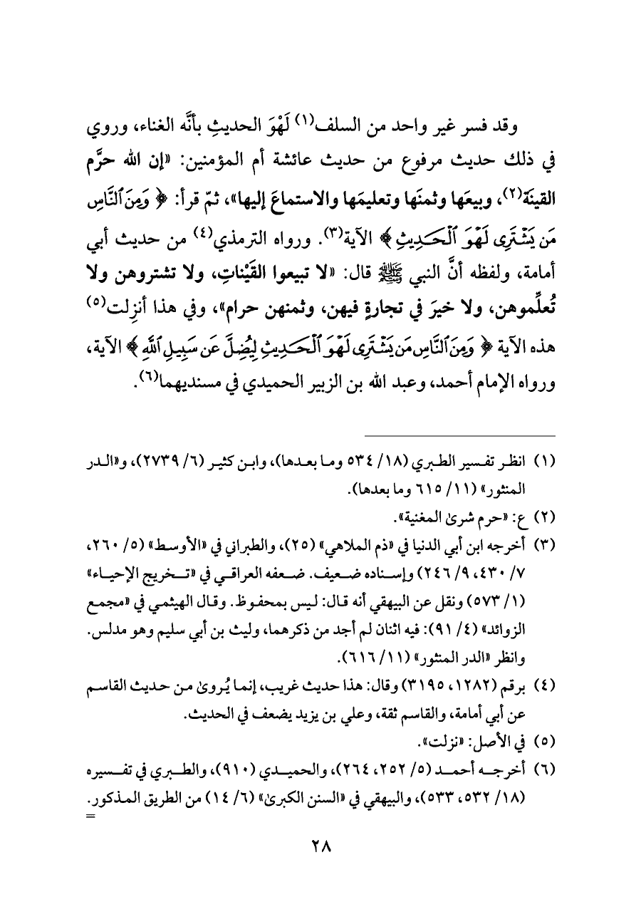 وقد فسر غير واحد من السلف (¬١) لَهْوَ الحديثِ بأنَّه الغناء، وروي في ذلك حديث مرفوع من حديث عائشة أم المؤمنين: "إن الله حرَّم القينَة (¬٢)، وبيعَها وثمنَها وتعليمَها والاستماعَ إليها"، ثمّ قرأ: {وَمِنَ النَّاسِ مَنْ يَشْتَرِي لَهْوَ الْحَدِيثِ} الآية (¬٣). ورواه الترمذي (¬٤) من حديث أبي أمامة، ولفظه أنَّ النبي - صلى الله عليه وسلم - قال: "لا تبيعوا القَيْناتِ، ولا تشتروهن ولا تُعلِّموهن، ولا خيرَ في تجارةٍ فيهن، وثمنهن حرام"، وفي هذا أنزِلت (¬٥) هذه الآية {وَمِنَ النَّاسِ مَنْ يَشْتَرِي لَهْوَ الْحَدِيثِ لِيُضِلَّ عَنْ سَبِيلِ اللَّهِ} الآية، ورواه الإمام أحمد، وعبد الله بن الزبير الحميدي في مسنديهما (¬٦).