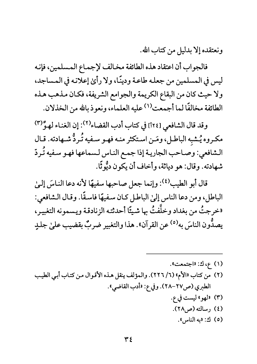 فالجواب أن اعتقاد هذه الطائفة مخالف لإجماع المسلمين، فإنه ليس في المسلمين من جعله طاعة ودينًا، ولا رأى إعلانه في المساجد، ولا حيث كان من البقاع الكريمة والجوامع الشريفة، فكان مذهب هذه الطائفة مخالفًا لما أجمعت (¬١) عليه العلماء، ونعوذ بالله من الخذلان.