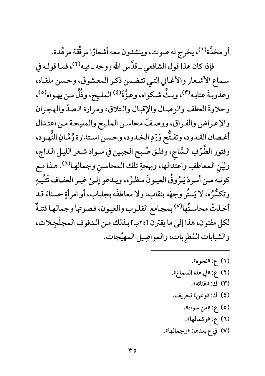 فإذا كان هذا قول الشافعي ــ قدَّس الله روحه ــ فيه (¬٢)، فما قوله في سماع الأشعار والأغاني التي تتضمن ذكر المعشوق، وحسن ملقاه، وعذوبةَ عتابه (¬٣)، وبثَّ شكواه، وعزَّةَ (¬٤) المليح، وذُلَّ من يهواه (¬٥)، وحلاوةَ العطف والوصال والإقبال والتلاق، ومرارة الصدّ والهجران والإعراض والفراق، ووصفَ محاسن المليح والمليحة من اعتدال أغصان القدود، وتفتُّح وَرْدِ الخدود، وحسن استدارة رُمَّانِ النُّهود، وفتور الطَّرْفِ السَّاجِ، وفلق صُبح الجبين في سواد شعر الليل الداج، ولِيْنِ المعاطفِ واعتدالها، وبهجةِ تلك المحاسنِ وجمالها (¬٦). هذا مع كونه من أمردَ يَرُوقُ العيونَ منظرُه، ويدعو إلى غير العفاف تَثنِّيهِ وتكسُّرُه، لا يَستُر وجهَه بنقاب، ولا معاطفَه بجلباب، أو امرأةٍ حسناءَ قد أخذتْ محاسنُها (¬٧) بمجامع القلوب والعيون، فصوتها وجمالها فتنةٌ لكل مفتون، هذا إلى ما يقترن [٢٤ ب] بذلك من الدفوف المجلْجِلات، والشبابات المُطرِبات، والمواصِيل المهيِّجات.