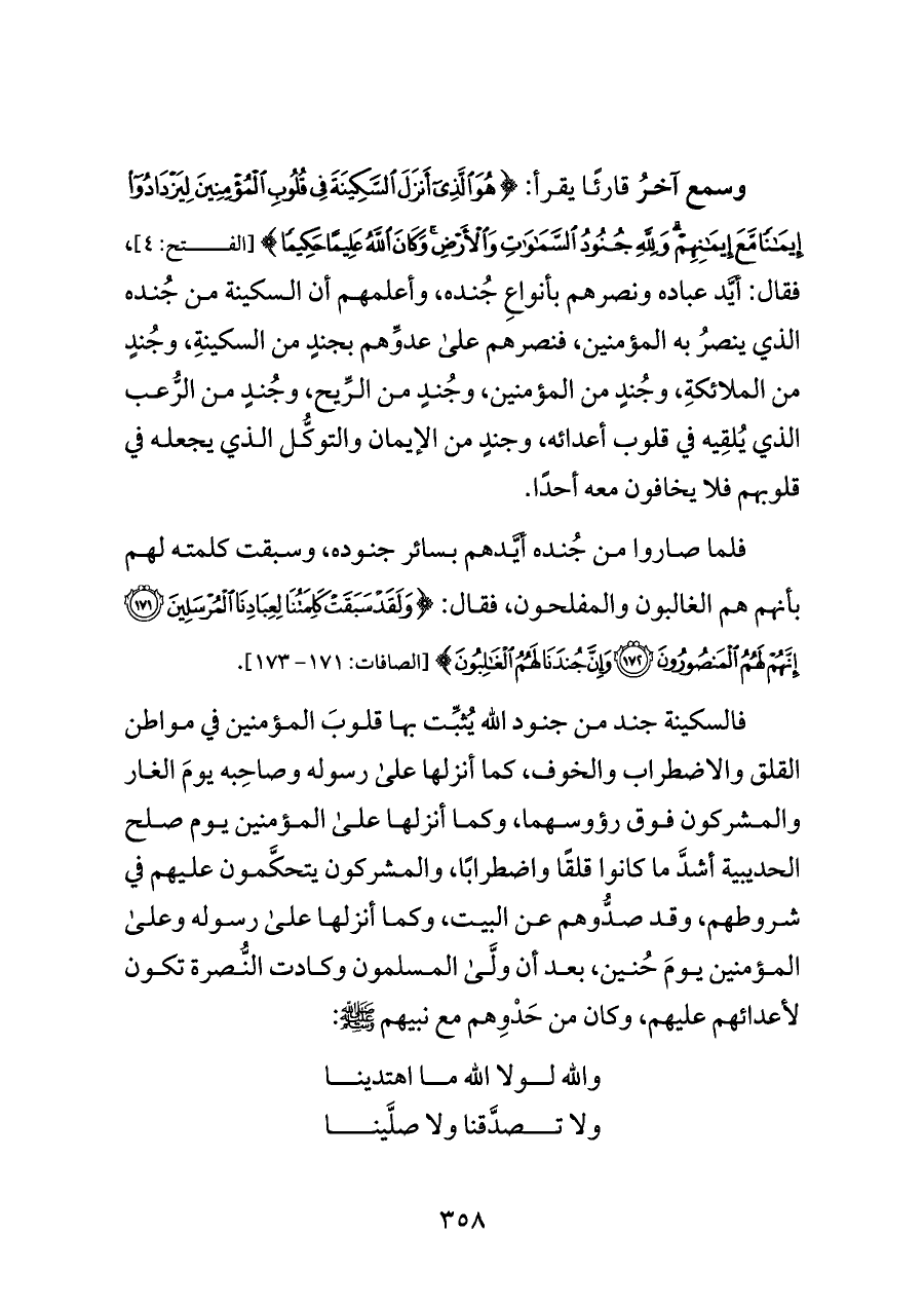 وسمع آخرُ قارئًا يقرأ: {هُوَ الَّذِي أَنْزَلَ السَّكِينَةَ فِي قُلُوبِ الْمُؤْمِنِينَ لِيَزْدَادُوا إِيمَانًا مَعَ إِيمَانِهِمْ وَلِلَّهِ جُنُودُ السَّمَاوَاتِ وَالْأَرْضِ وَكَانَ اللَّهُ عَلِيمًا حَكِيمًا} [الفتح: ٤]، فقال: أيَّد عباده ونصرهم بأنواعِ جُنده، وأعلمهم أن السكينة من جُنده الذي ينصرُ به المؤمنين، فنصرهم على عدوِّهم بجندٍ من السكينةِ، وجُندٍ من الملائكةِ، وجُندٍ من المؤمنين، وجُندٍ من الرِّيح، وجُندٍ من الرُّعب الذي يُلقِيه في قلوب أعدائه، وجندٍ من الإيمان والتوكُّل الذي يجعله في قلوبهم فلا يخافون معه أحدًا.