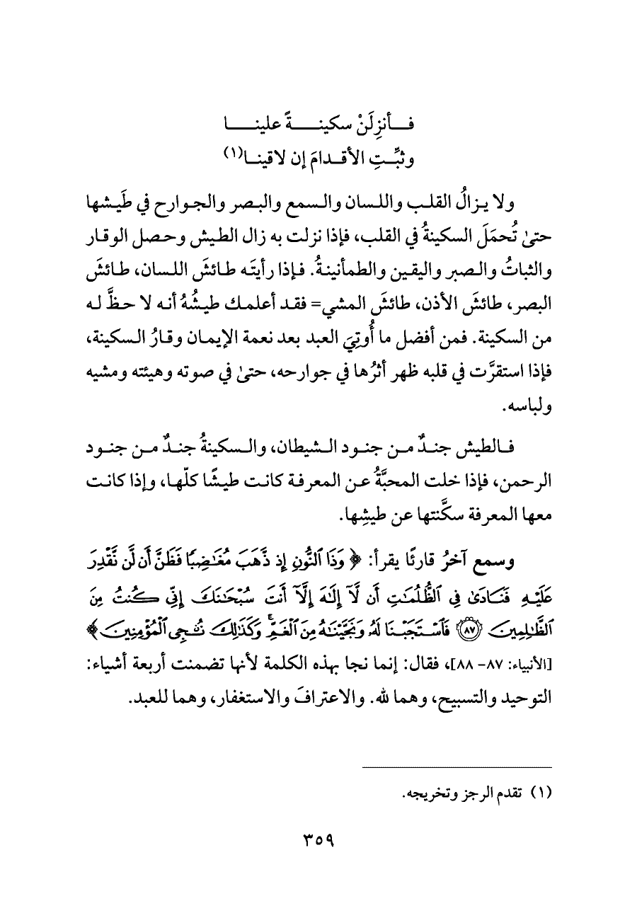 ولا يزالُ القلب واللسان والسمع والبصر والجوارح في طَيشها حتى تُحمَلَ السكينةُ في القلب، فإذا نزلت به زال الطيش وحصل الوقار والثباتُ والصبر واليقين والطمأنينةُ. فإذا رأيتَه طائشَ اللسان، طائشَ البصر، طائشَ الأذن، طائشَ المشي= فقد أعلمك طيشُهُ أنه لا حظَّ له من السكينة. فمن أفضل ما أُوتِيَ العبد بعد نعمة الإيمان وقارُ السكينة، فإذا استقرَّت في قلبه ظهر أثرُها في جوارحه، حتى في صوته وهيئته ومشيه ولباسه.