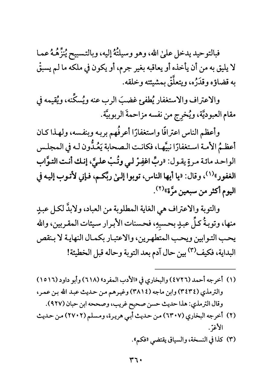 وأعظم الناس اعترافًا واستغفارًا أعرفُهم بربه وبنفسه، ولهذا كان أعظمُ الأمة استغفارًا نبيَّها، فكانت الصحابة يَعُدُّون له في المجلس الواحد مائة مرةٍ يقول: "ربِّ اغفِرْ لي وتُبْ عليَّ، إنك أنت التوَّاب الغفور" (¬١)، وقال: "يا أيها الناس، توبوا إلى ربِّكم، فإني لأتوب إليه في اليوم أكثر من سبعين مرَّة" (¬٢).