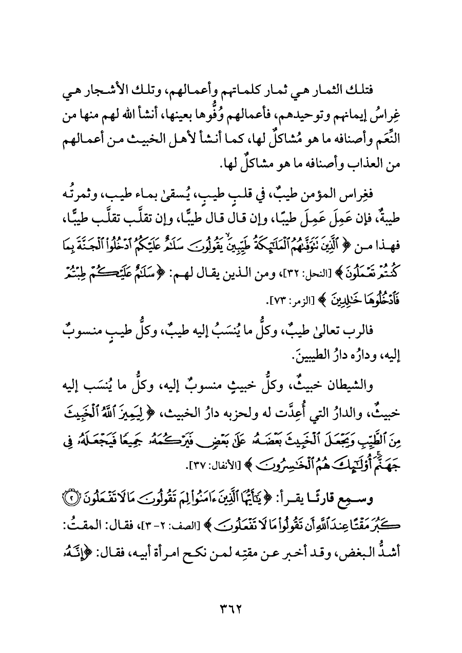 فغِراس المؤمن طيبٌ، في قلبٍ طيبٍ، يُسقى بماء طيب، وثمرتُه طيبةٌ، فإن عَمِلَ عَمِلَ طيبًا، وإن قال قال طيبًّا، وإن تقلَّب تقلَّب طيبًّا، فهذا من {الَّذِينَ تَتَوَفَّاهُمُ الْمَلَائِكَةُ طَيِّبِينَ يَقُولُونَ سَلَامٌ عَلَيْكُمُ ادْخُلُوا الْجَنَّةَ بِمَا كُنْتُمْ تَعْمَلُونَ} [النحل: ٣٢]، ومن الذين يقال لهم: {سَلَامٌ عَلَيْكُمْ طِبْتُمْ فَادْخُلُوهَا خَالِدِينَ} [الزمر: ٧٣].