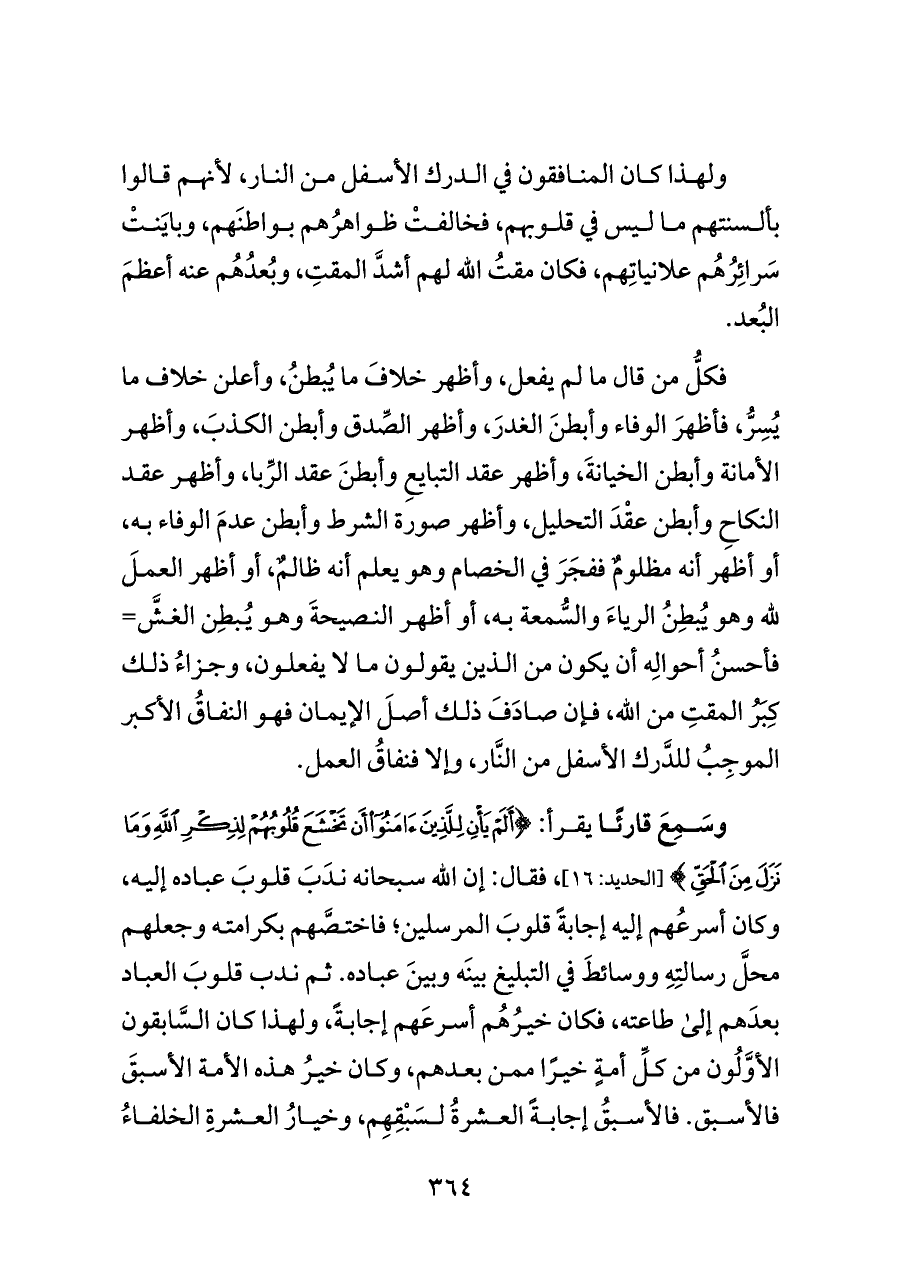 وسَمِعَ قارئًا يقرأ: {أَلَمْ يَأْنِ لِلَّذِينَ آمَنُوا أَنْ تَخْشَعَ قُلُوبُهُمْ لِذِكْرِ اللَّهِ وَمَا نَزَلَ مِنَ الْحَقِّ} [الحديد: ١٦]، فقال: إن الله سبحانه ندَبَ قلوبَ عباده إليه، وكان أسرعُهم إليه إجابةً قلوبَ المرسلين؛ فاختصَّهم بكرامته وجعلهم محلَّ رسالتِهِ ووسائطَ في التبليغ بينَه وبينَ عباده. ثم ندب قلوبَ العباد بعدَهم إلى طاعته، فكان خيرُهُم أسرعَهم إجابةً، ولهذا كان السَّابقون الأوَّلُون من كلِّ أمةٍ خيرًا ممن بعدهم، وكان خيرُ هذه الأمة الأسبقَ فالأسبق. فالأسبقُ إجابةً العشرةُ لسَبْقِهِم، وخيارُ العشرةِ الخلفاءُ