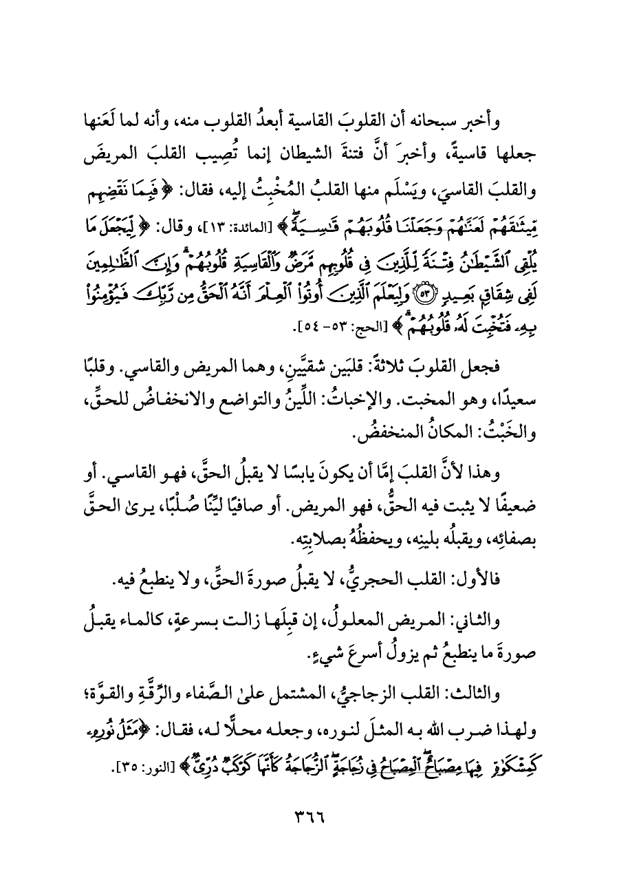 وهذا لأنَّ القلبَ إمَّا أن يكونَ يابسًا لا يقبلُ الحقَّ، فهو القاسي. أو ضعيفًا لا يثبت فيه الحقُّ، فهو المريض. أو صافيًا ليِّنًا صُلْبًا، يرى الحقَّ بصفائِه، ويقبلُه بلينِه، ويحفظُهُ بصلابِتِه.