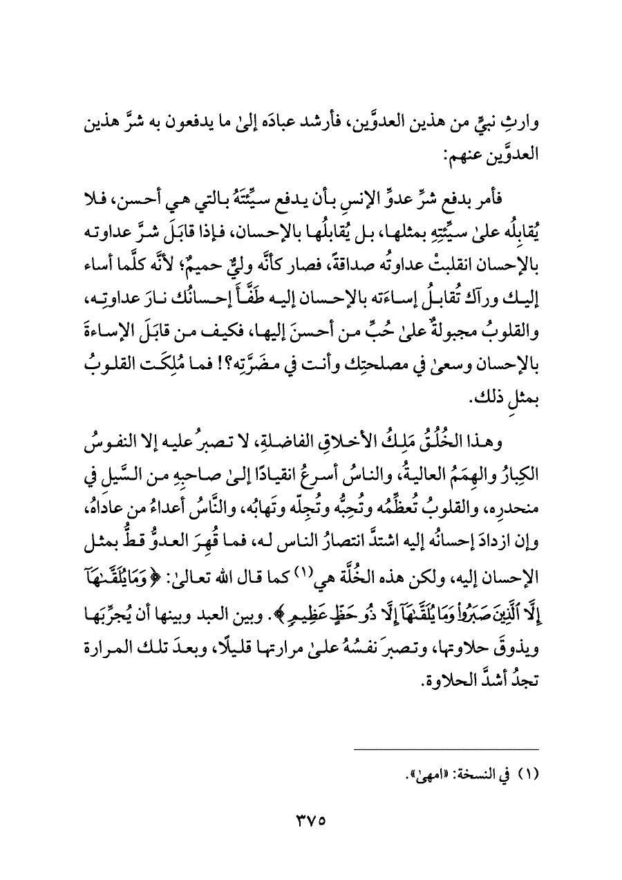 فأمر بدفع شرِّ عدوِّ الإنسِ بأن يدفع سيِّئتَهُ بالتي هي أحسن، فلا يُقابِلُه على سيِّئتِهِ بمثلها، بل يُقابلُها بالإحسان، فإذا قابَلَ شرَّ عداوته بالإحسان انقلبتْ عداوتُه صداقةً، فصار كأنَّه وليٌّ حميمٌ؛ لأنَّه كلَّما أساء إليك ورآك تُقابلُ إساءَته بالإحسان إليه طَفَّأَ إحسانُك نارَ عداوتِه، والقلوبُ مجبولةٌ على حُبِّ من أحسنَ إليها، فكيف من قابَلَ الإساءةَ بالإحسان وسعى في مصلحتِك وأنت في مضَرَّتِه؟! فما مُلِكَت القلوبُ بمثلِ ذلك.