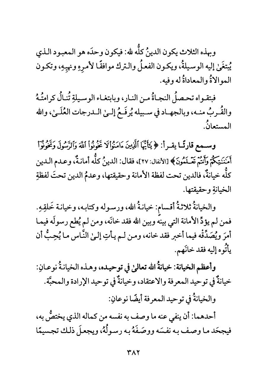 وأعظم الخيانة: خيانةُ الله تعالى في توحيده، وهذه الخيانةُ نوعانِ: خيانةٌ في توحيد المعرفة والاعتقاد، وخيانةٌ في توحيد الإرادة والمحبَّة.