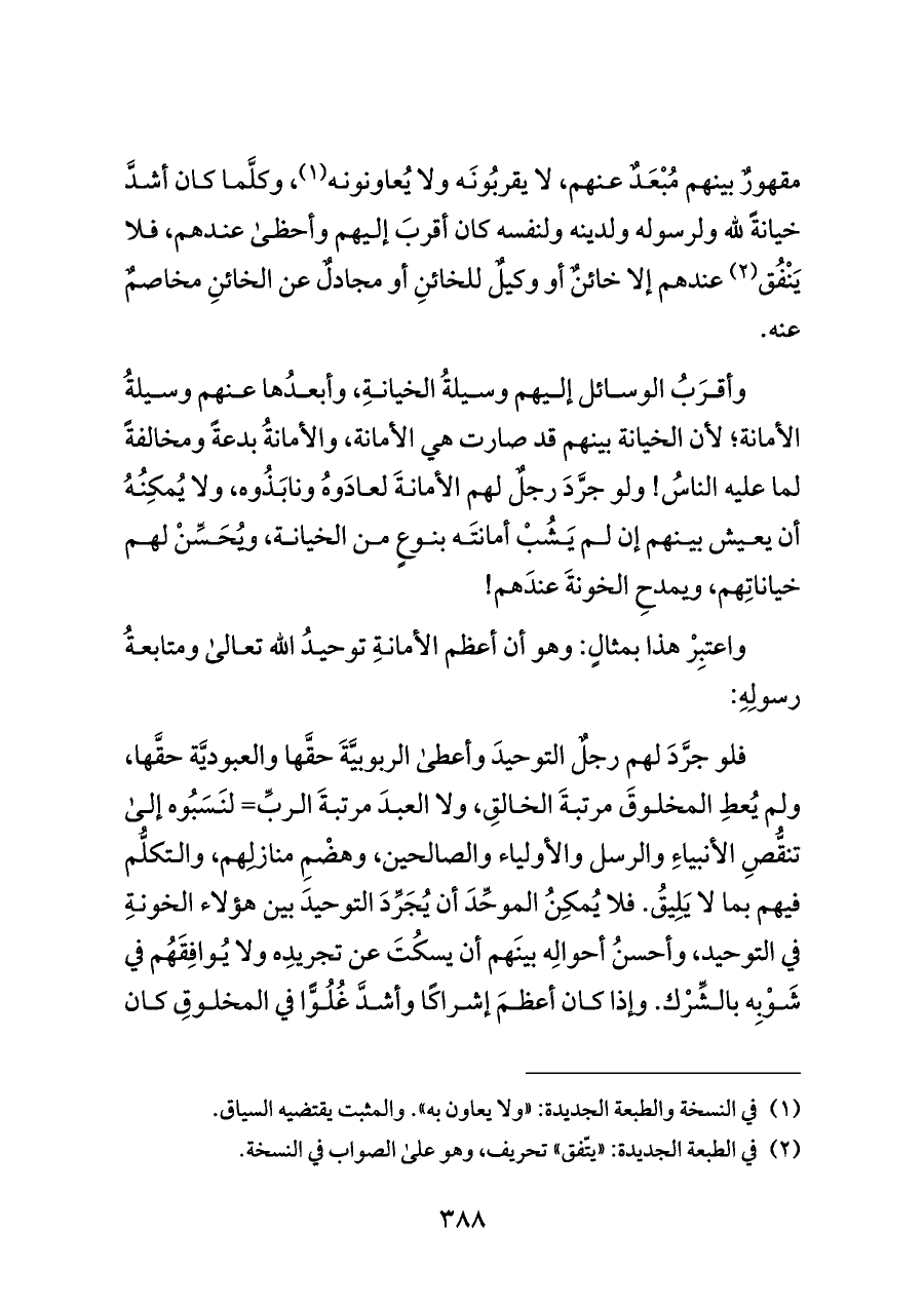 واعتبِرْ هذا بمثالٍ: وهو أن أعظم الأمانةِ توحيدُ الله تعالى ومتابعةُ رسولِهِ: