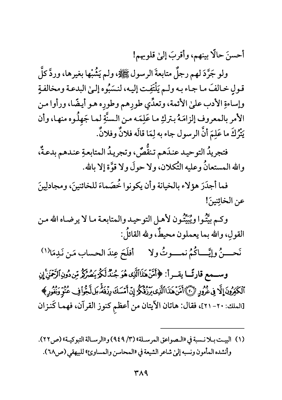 ولو جَرَّدَ لهم رجلٌ متابعةَ الرسول - صلى الله عليه وسلم -، ولم يَشُبْها بغيرها، وردَّ كلَّ قولٍ خالفَ ما جاء به ولم يَلْتَفِت إليه، لنسَبُوه إلى البدعة ومخالفةٍ وإساءةِ الأدب على الأئمة، وتعدِّي طورِهم وطورِه هو أيضًا، ورأوا من الأمر بالمعروف إلزامَهُ بتركِ ما عَلِمَه من السنَّةِ لما جَهِلُوه منها، وأن يَتْرُكَ ما عَلِمَ أنَّ الرسول جاء به لِمَا قالَه فلانٌ وفلانٌ.