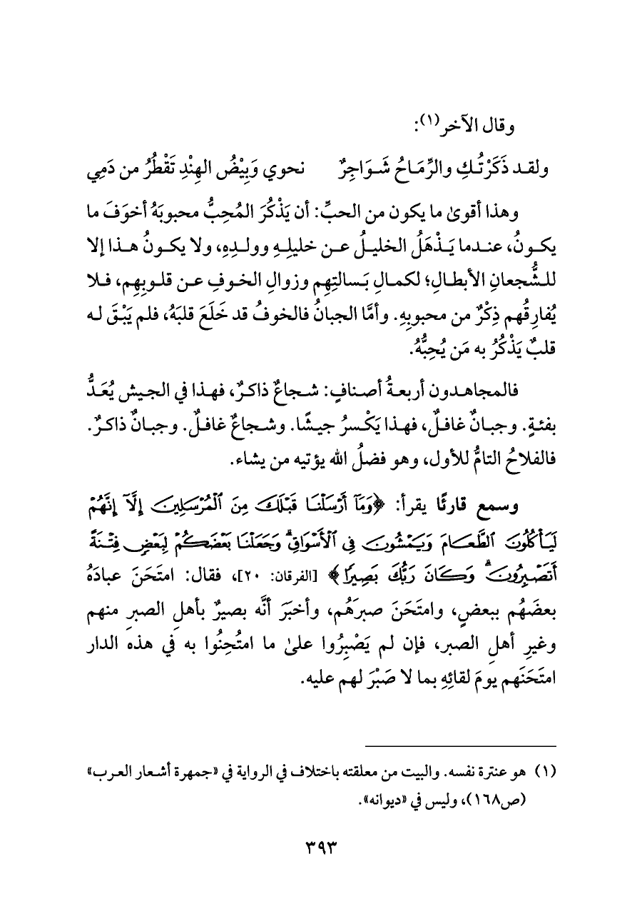 وهذا أقوى ما يكون من الحبِّ: أن يَذْكُرَ المُحِبُّ محبوبَهُ أخوَفَ ما يكونُ، عندما يَذْهَلُ الخليلُ عن خليلِهِ وولدِهِ، ولا يكونُ هذا إلا للشُّجعانِ الأبطالِ؛ لكمالِ بَسالتِهِم وزوالِ الخوفِ عن قلوبِهِم، فلا يُفارِقُهم ذِكْرٌ من محبوبِهِ. وأمَّا الجبانُ فالخوفُ قد خَلَعَ قلبَهُ، فلم يَبْقَ له قلبٌ يَذْكُرُ به مَن يُحِبُّهُ.