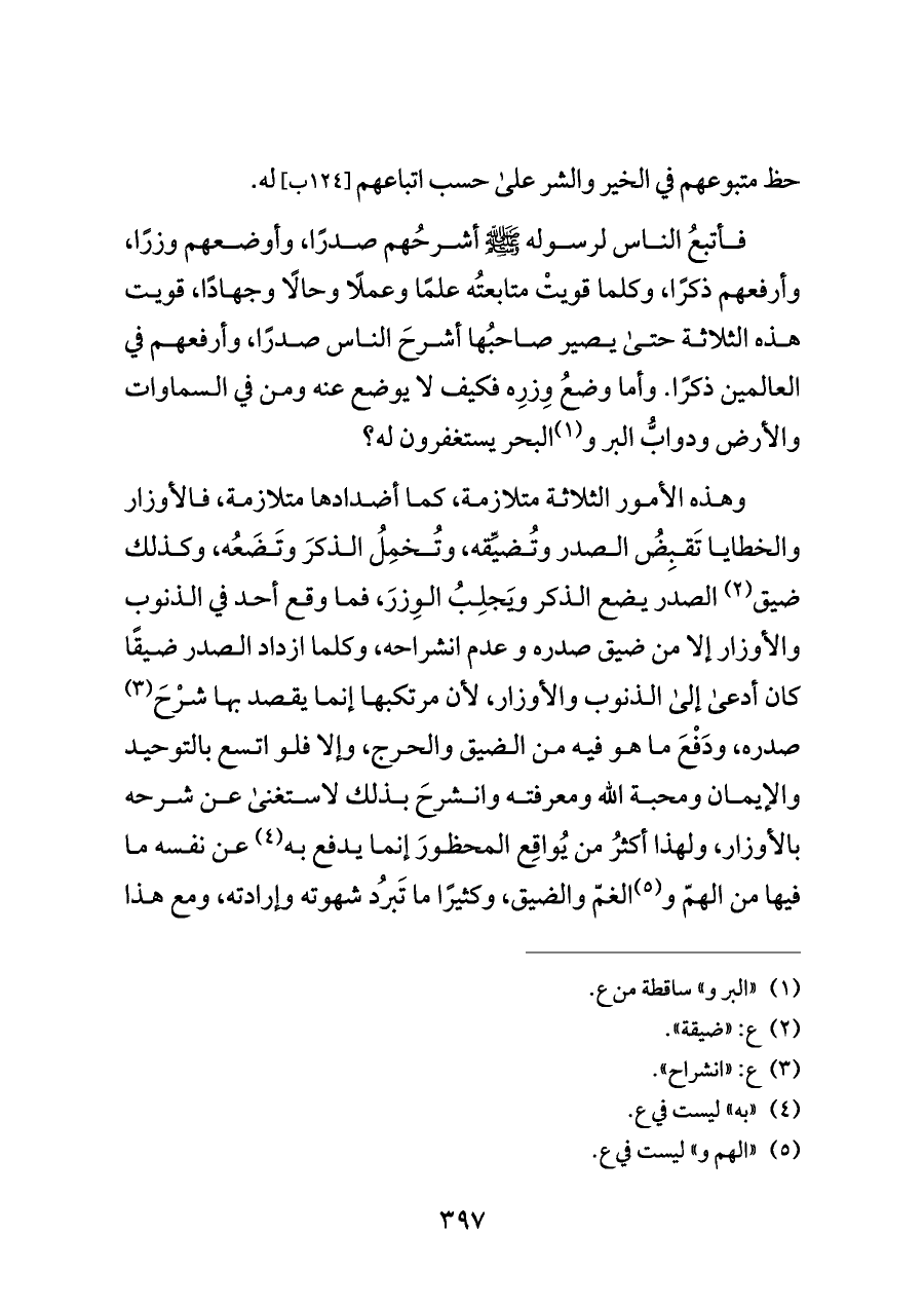 فأتبعُ الناس لرسوله - صلى الله عليه وسلم - أشرحُهم صدرًا، وأوضعهم وزرًا، وأرفعهم ذكرًا، وكلما قويتْ متابعتُه علمًا وعملًا وحالًا وجهادًا، قويت هذه الثلاثة حتى يصير صاحبُها أشرحَ الناس صدرًا، وأرفعهم في العالمين ذكرًا. وأما وضعُ وِزرِه فكيف لا يوضع عنه ومن في السماوات والأرض ودوابُّ البر و (¬١) البحر يستغفرون له؟
