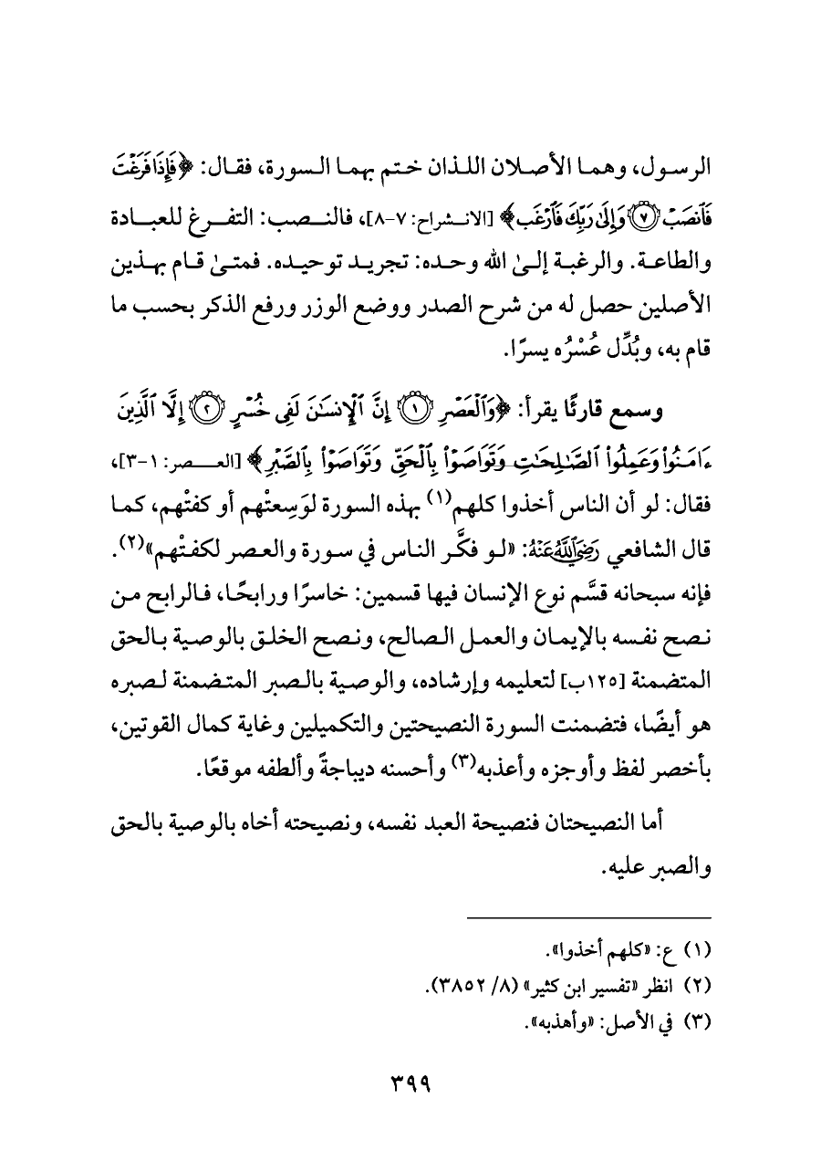 وسمع قارئًا يقرأ: {وَالْعَصْرِ (١) إِنَّ الْإِنْسَانَ لَفِي خُسْرٍ (٢) إِلَّا الَّذِينَ آمَنُوا وَعَمِلُوا الصَّالِحَاتِ وَتَوَاصَوْا بِالْحَقِّ وَتَوَاصَوْا بِالصَّبْرِ} [العصر: ١ - ٣]، فقال: لو أن الناس أخذوا كلهم (¬١) بهذه السورة لوَسِعتْهم أو كفتْهم، كما قال الشافعي - رضي الله عنه -: "لو فكَّر الناس في سورة والعصر لكفتْهم" (¬٢). فإنه سبحانه قسَّم نوع الإنسان فيها قسمين: خاسرًا ورابحًا، فالرابح من نصح نفسه بالإيمان والعمل الصالح، ونصح الخلق بالوصية بالحق المتضمنة [١٢٥ ب] لتعليمه وإرشاده، والوصية بالصبر المتضمنة لصبره هو أيضًا، فتضمنت السورة النصيحتين والتكميلين وغاية كمال القوتين، بأخصر لفظ وأوجزه وأعذبه (¬٣) وأحسنه ديباجةً وألطفه موقعًا.