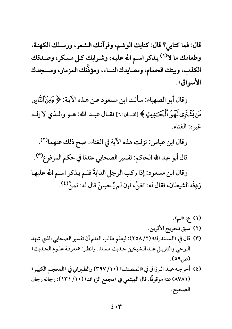 وقال أبو الصهباء: سألت ابن مسعود عن هذه الآية: {وَمِنَ النَّاسِ مَنْ يَشْتَرِي لَهْوَ الْحَدِيثِ} [لقمان: ٦] فقال عبد الله: هو والذي لا إله غيره: الغناء.