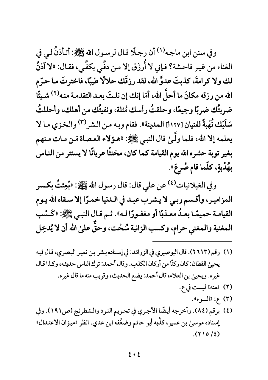 وفي الغيلانيات (¬٤) عن علي قال: قال رسول الله - صلى الله عليه وسلم -: "بُعِثتُ بكسر المزامير، وأقسم ربي لا يشرب عبد في الدنيا خمرًا إلا سقاه الله يوم القيامة حميمًا بعدُ معذبًا أو مغفورًا له". ثم قال النبي - صلى الله عليه وسلم -: "كَسْب المغنية والمغني حرام، وكسب الزانية سُحْت، وحقٌّ على الله أن لا يُدخِل