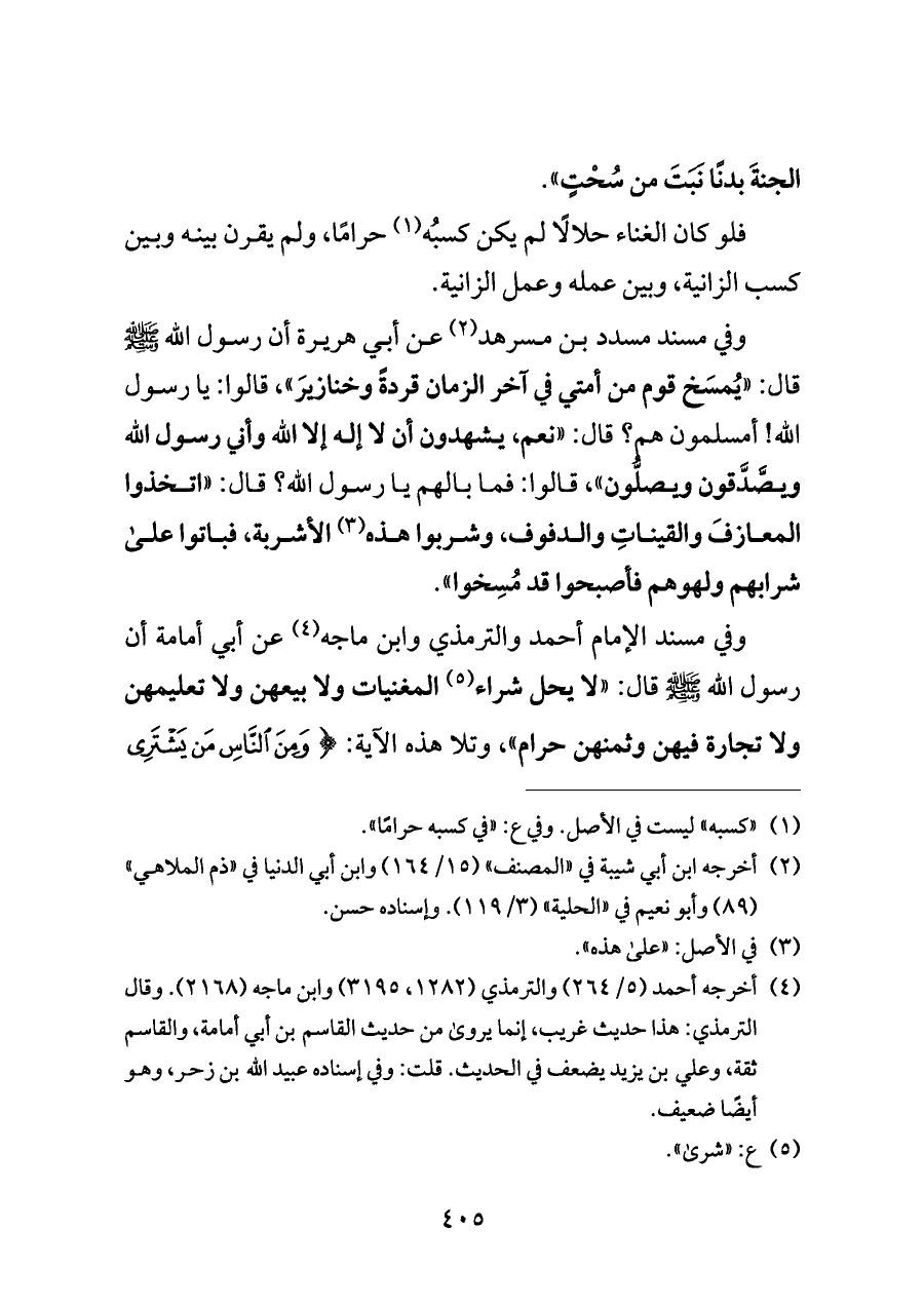 وفي مسند مسدد بن مسرهد (¬٢) عن أبي هريرة أن رسول الله - صلى الله عليه وسلم - قال: "يُمسَخ قوم من أمتي في آخر الزمان قردةً وخنازيرَ"، قالوا: يا رسول الله! أمسلمون هم؟ قال: "نعم، يشهدون أن لا إله إلا الله وأني رسول الله ويصَّدَّقون ويصلُّون"، قالوا: فما بالهم يا رسول الله؟ قال: "اتخذوا المعازفَ والقيناتِ والدفوف، وشربوا هذه (¬٣) الأشربة، فباتوا على شرابهم ولهوهم فأصبحوا قد مُسِخوا".