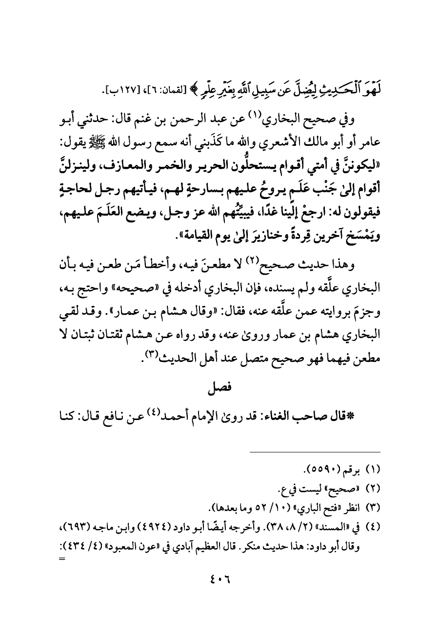 وفي صحيح البخاري (¬١) عن عبد الرحمن بن غنم قال: حدثني أبو عامر أو أبو مالك الأشعري والله ما كَذَبني أنه سمع رسول الله - صلى الله عليه وسلم - يقول: "ليكوننَّ في أمتي أقوام يستحلُّون الحرير والخمر والمعازف، ولينزلنَّ أقوام إلى جَنْب عَلَمٍ يروحُ عليهم بسارحةٍ لهم، فيأتيهم رجل لحاجةٍ فيقولون له: ارجعْ إلينا غدًا، فيبيِّتُهم الله عز وجل، ويضع العَلَمَ عليهم، ويَمْسَخ آخرين قِردةً وخنازيرَ إلى يوم القيامة".