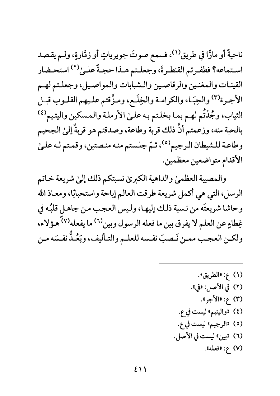 ناحيةً أو مارًّا في طريق (¬١)، فسمع صوتَ جويرياتٍ أو زمَّارةٍ، ولم يقصد استماعه؟ فطفرتم القنطرةَ، وجعلتم هذا حجةً على (¬٢) استحضار القينات والمغنين والرقاصين والشبابات والمواصيل، وجعلتم لهم الأجرة (¬٣) والحِبَاء والكرامة والخِلَع، ومزَّقتم عليهم القلوب قبل الثياب، وجُدْتُم لهم بما بخلتم به على الأرملة والمسكين واليتيم (¬٤) بالحبة منه، وزعمتم أنَّ ذلك قربة وطاعة، وصدقتم هو قربةٌ إلى الجحيم وطاعة للشيطان الرجيم (¬٥)، ثمّ جلستم منه منصتين، وقمتم له على الأقدام متواضعين معظمين.