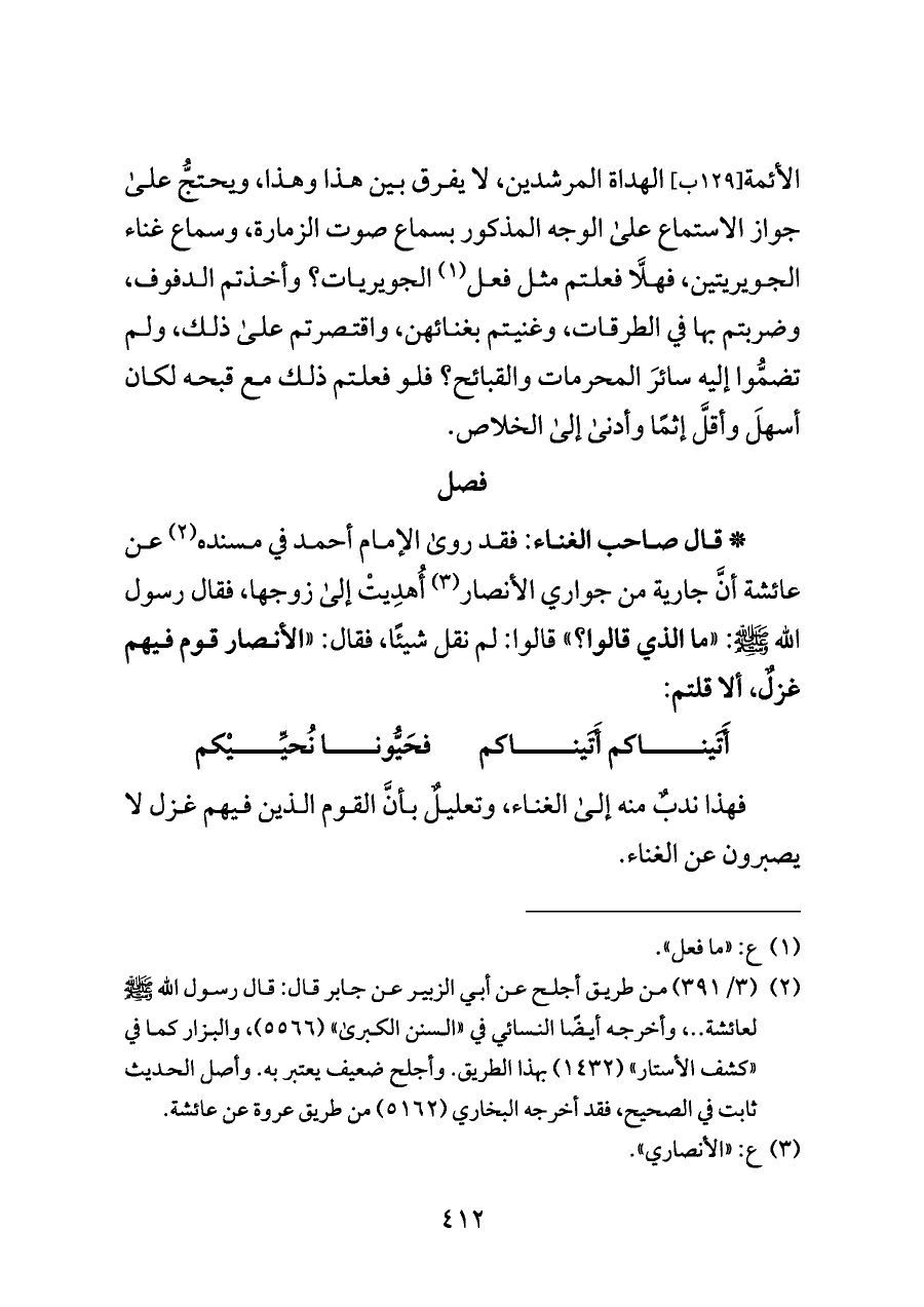 * قال صاحب الغناء: فقد روى الإمام أحمد في مسنده (¬٢) عن عائشة أنَّ جارية من جواري الأنصار (¬٣) أُهدِيتْ إلى زوجها، فقال رسول الله - صلى الله عليه وسلم -: "ما الذي قالوا؟ " قالوا: لم نقل شيئًا، فقال: "الأنصار قوم فيهم غزلٌ، ألا قلتم: