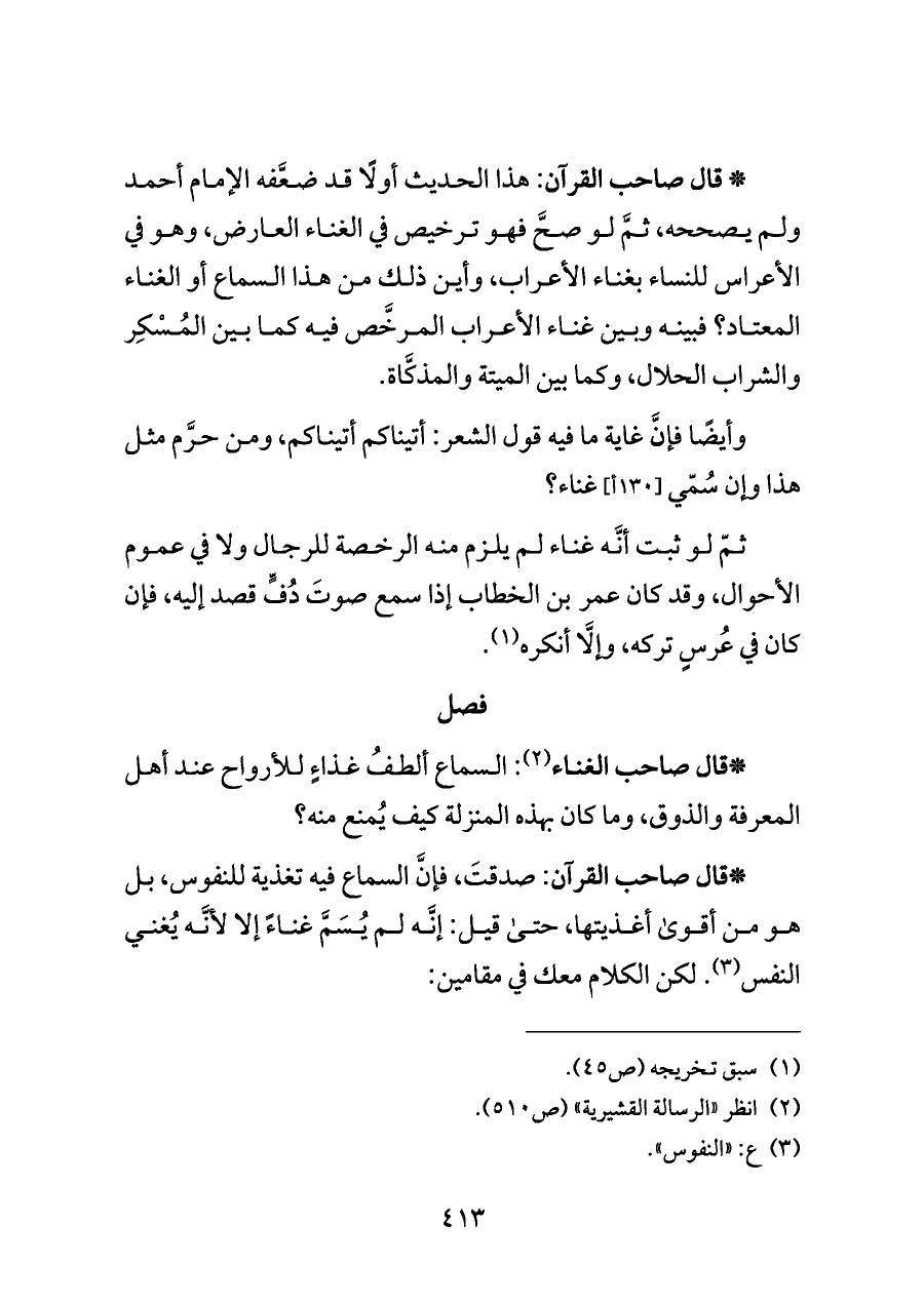 *قال صاحب القرآن: صدقتَ، فإنَّ السماع فيه تغذية للنفوس، بل هو من أقوى أغذيتها، حتى قيل: إنَّه لم يُسَمَّ غناءً إلا لأنَّه يُغني النفس (¬٣). لكن الكلام معك في مقامين:
