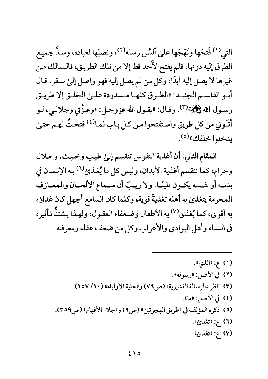 التي (¬١) فَتحَها ونَهَجَها على ألسُن رسله (¬٢)، ونصبَها لعباده، وسدَّ جميع الطرق إليه دونها، فلم يفتح لأَحد قط إلا من تلك الطريق، فالسالك من غيرها لا يصل إليه أبدًا، وكل من لم يصل إليه فهو واصل إلى سقر. قال أبو القاسم الجنيد: "الطرق كلها مسدودة على الخلق إلا طريق رسول الله - صلى الله عليه وسلم - " (¬٣). وقال: "يقول الله عزوجل: "وعزَّتي وجلالي، لو أتَوني من كل طريق واستفتحوا من كل باب لما (¬٤) فتحتُ لهم حتى يدخلوا خلفك" (¬٥).