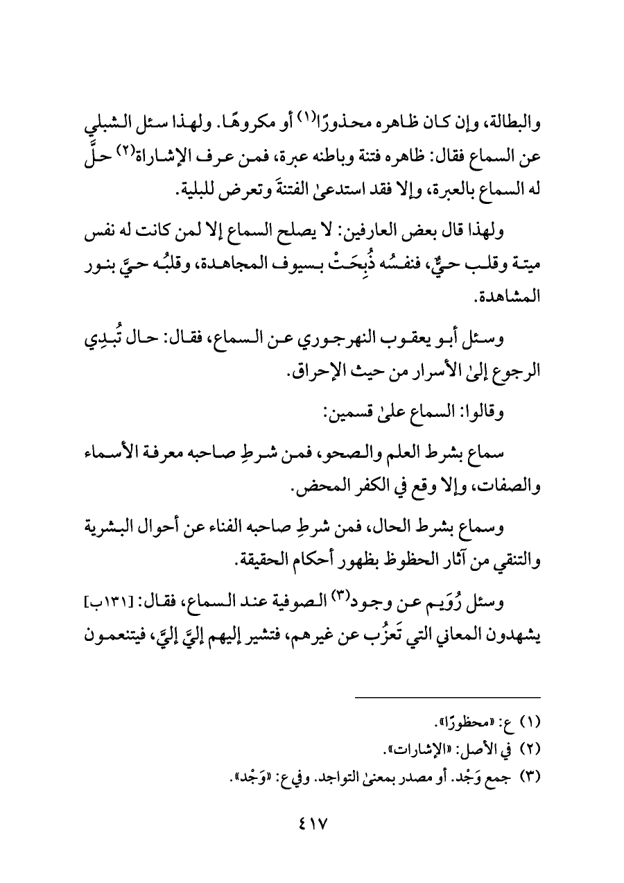 والبطالة، وإن كان ظاهره محذورًا (¬١) أو مكروهًا. ولهذا سئل الشبلي عن السماع فقال: ظاهره فتنة وباطنه عبرة، فمن عرف الإشاراة (¬٢) حلَّ له السماع بالعبرة، وإلا فقد استدعى الفتنةَ وتعرض للبلية.