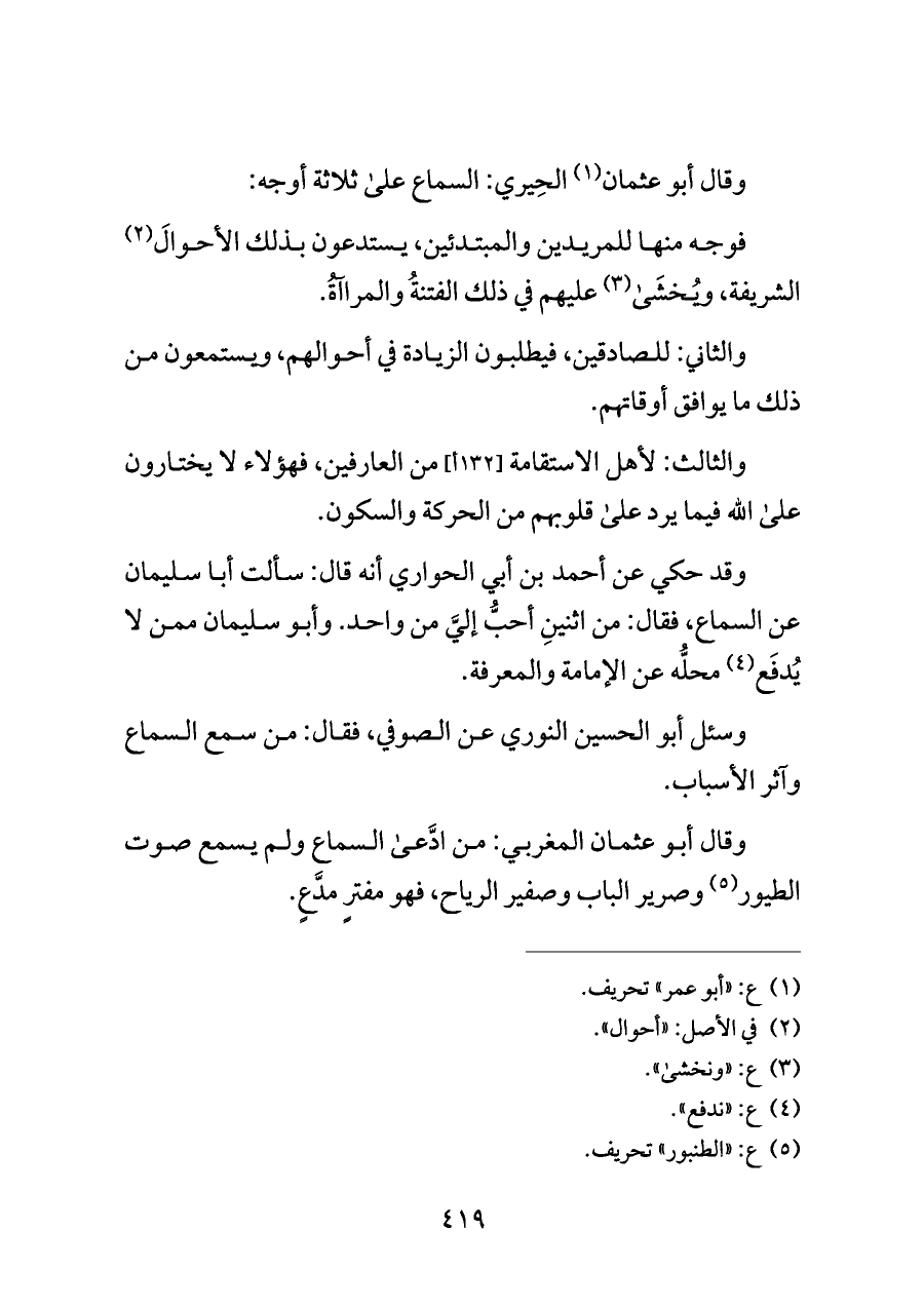 وقال أبو عثمان (¬١) الحِيري: السماع على ثلاثة أوجه: