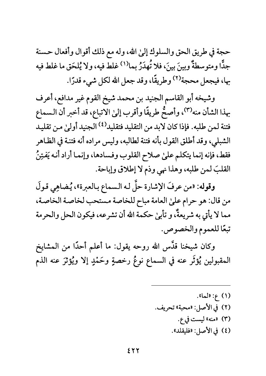 وقوله: "من عرفَ الإشارة حلَّ له السماع بالعبرة"، يُضاهِي قولَ من قال: هو حرام على العامة مباح للخاصة مستحب لخاصة الخاصة، مما لا يأتي به شريعةٌ، و تأبى حكمة الله أن تشرعه، فيكون الحل والحرمة تبعًا للعموم والخصوص.