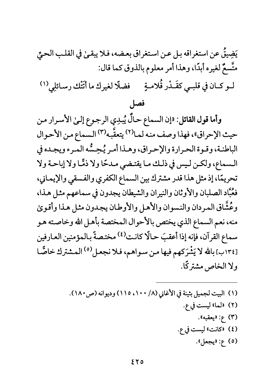 وأما قول القائل: "إن السماع حالٌ يُبدِي الرجوع إلى الأسرار من حيث الإحراق"، فهذا وصف منه لما (¬٢) يتعقَّبه (¬٣) السماع من الأحوال الباطنة، وقوة الحرارة والإحراق، وهذا أمر يُحِسُّه المرء ويجده في السماع، ولكن ليس في ذلك ما يقتضي مدحًا ولا ذمًّا ولا إباحة ولا تحريمًا، إذ مثل هذا قدر مشترك بين السماع الكفري والفسقي والإيماني، فعُبَّاد الصلبان والأوثان والنيران والشيطان يجدون في سماعهم مثل هذا، وعُشَّاق المردان والنسوان والأهل والأوطان يجدون مثل هذا وأقوى منه، نعم السماع الذي يختص بالأحوال المختصة بأهل الله وخاصته هو سماع القرآن، فإنه إذا أعقبَ حالًا كانت (¬٤) مختصةً بالمؤمنين العارفين [١٣٤ ب] بالله لا يَشْرَكهم فيها من سواهم، فلا نجعل (¬٥) المشترك خاصًّا ولا الخاص مشتركًا.