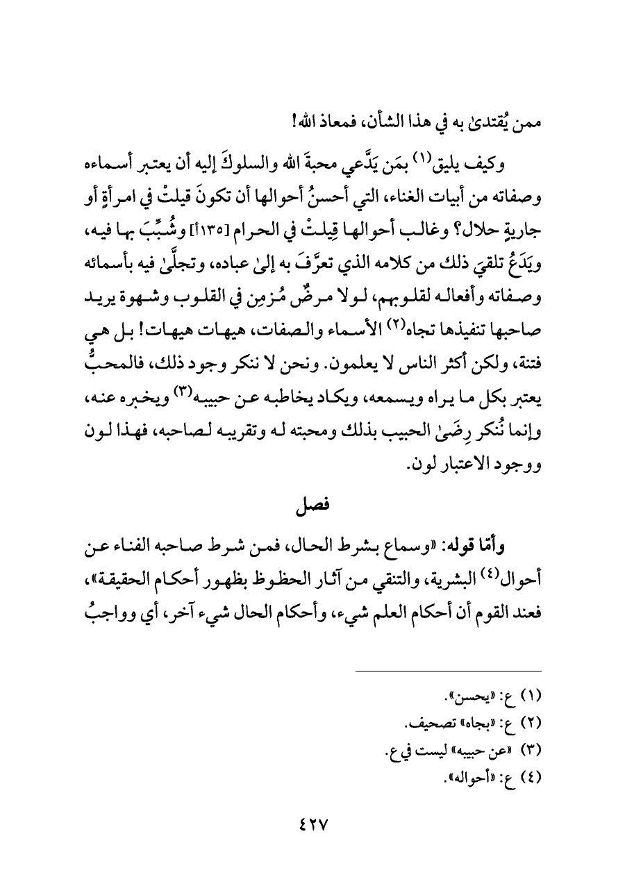 وكيف يليق (¬١) بمَن يَدَّعي محبةَ الله والسلوكَ إليه أن يعتبر أسماءه وصفاته من أبيات الغناء، التي أحسنُ أحوالها أن تكونَ قيلتْ في امرأةٍ أو جاريةٍ حلال؟ وغالب أحوالها قِيلتْ في الحرام [١٣٥ أ] وشُبِّبَ بها فيه، ويَدَعُ تلقيَ ذلك من كلامه الذي تعرَّفَ به إلى عباده، وتجلَّى فيه بأسمائه وصفاته وأفعاله لقلوبهم، لولا مرضٌ مُزمِن في القلوب وشهوة يريد صاحبها تنفيذها تجاه (¬٢) الأسماء والصفات، هيهات هيهات! بل هي فتنة، ولكن أكثر الناس لا يعلمون. ونحن لا ننكر وجود ذلك، فالمحبُّ يعتبر بكل ما يراه ويسمعه، ويكاد يخاطبه عن حبيبه (¬٣) ويخبره عنه، وإنما نُنكر رِضَى الحبيب بذلك ومحبته له وتقريبه لصاحبه، فهذا لون ووجود الاعتبار لون.