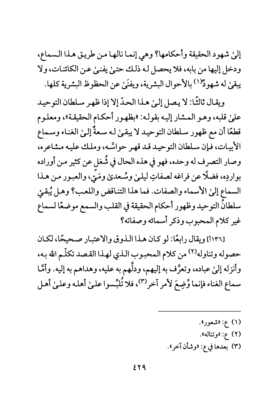 ويقال ثالثًا: لا يصل إلى هذا الحدّ إلا إذا ظهر سلطان التوحيد على قلبه، وهو المشار إليه بقوله: "بظهور أحكام الحقيقة"، ومعلوم قطعًا أن مع ظهور سلطان التوحيد لا يبقى له سعةٌ إلى الغناء وسماع الأبيات، فإن سلطان التوحيد قد قهر حواسَّه، وملك عليه مشاعره، وصار التصرف له وحده، فهو في هذه الحال في شُغلٍ عن كثير من أوراده بواردِه، فضلًا عن فراغه لصفاتِ ليلى وسُعدى ومَيّ، والعبور من هذا السماع إلى الأسماء والصفات. فما هذا التناقض واللعب؟ وهل يُبقيْ سلطانُ التوحيد وظهور أحكام الحقيقة في القلب والسمع موضعًا لسماع غير كلام المحبوب وذكر أسمائه وصفاته؟